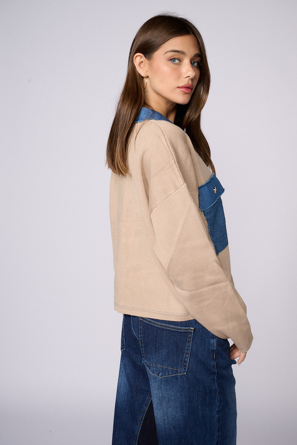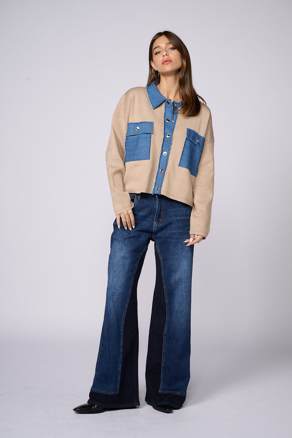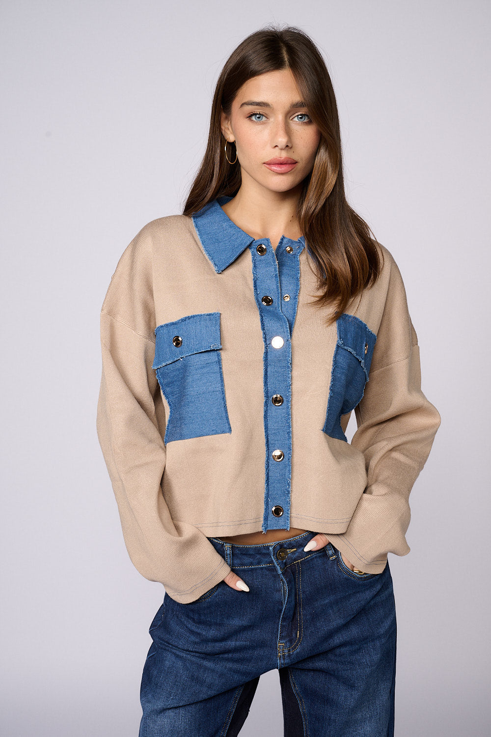 ג'קט סריג ריב בשילוב כיסים וצווארון ג'ינס בסגירת כפתורים