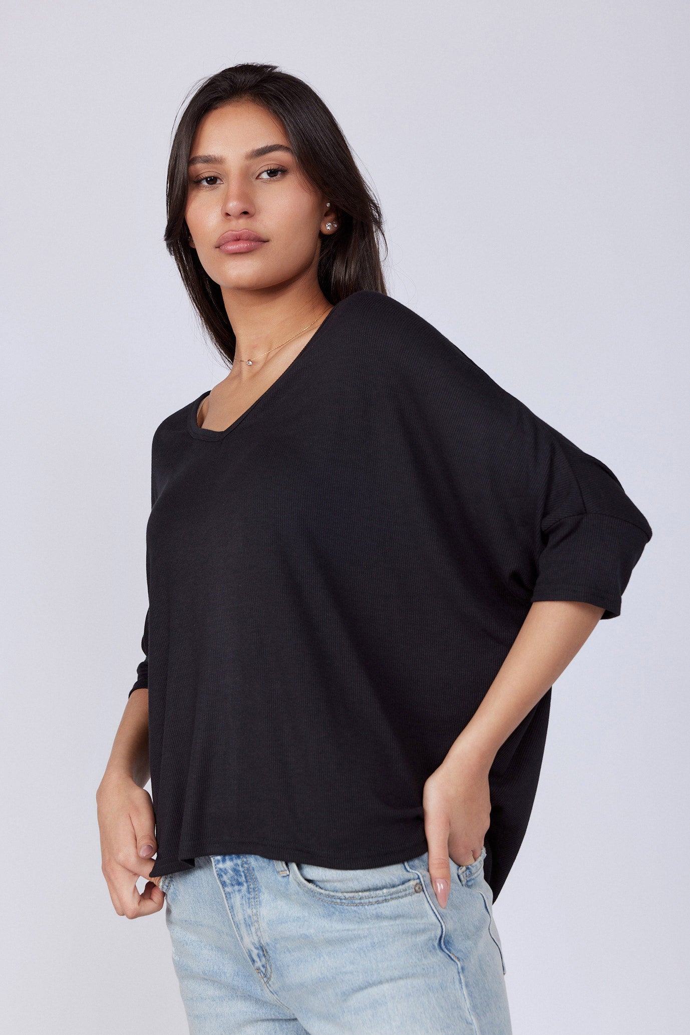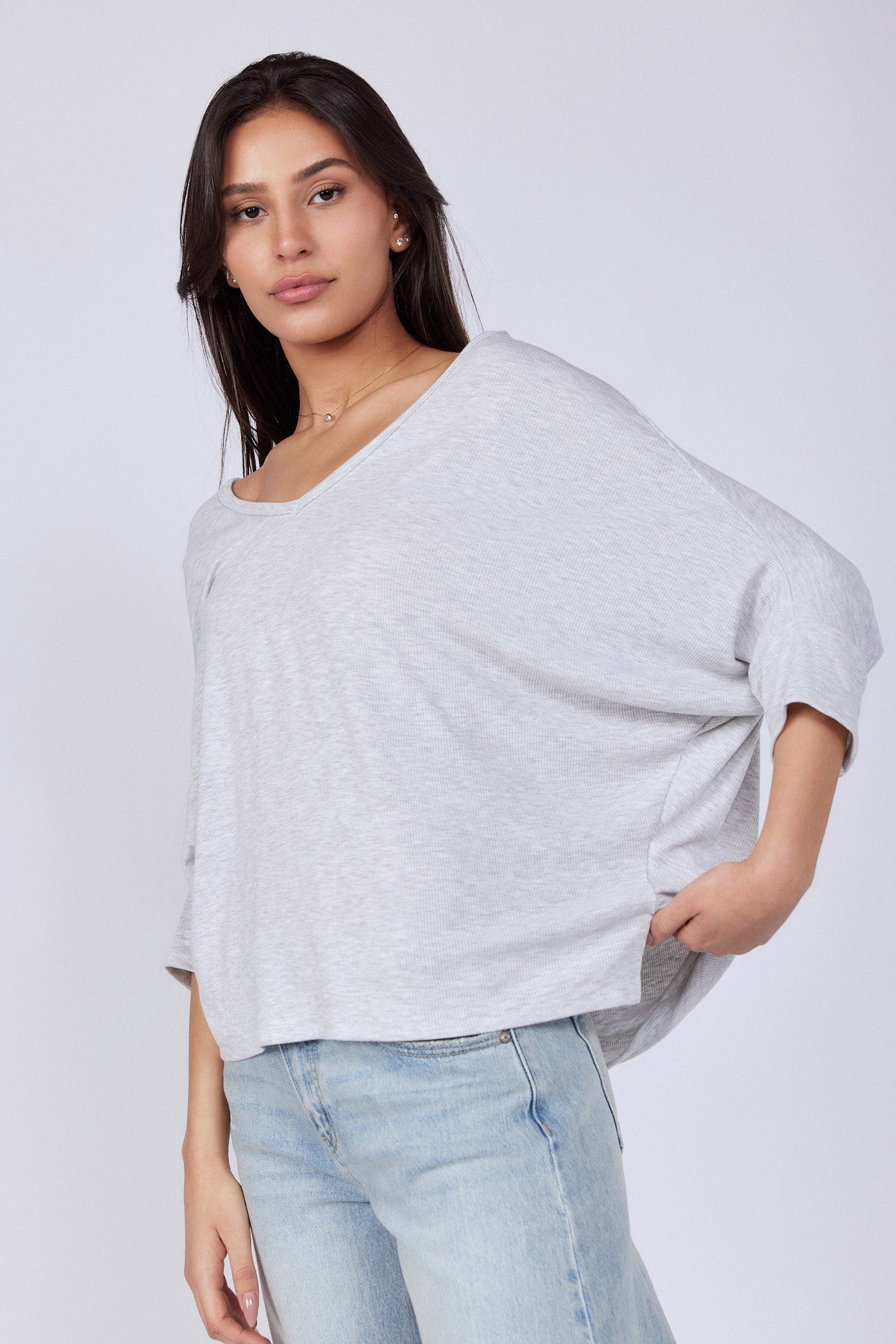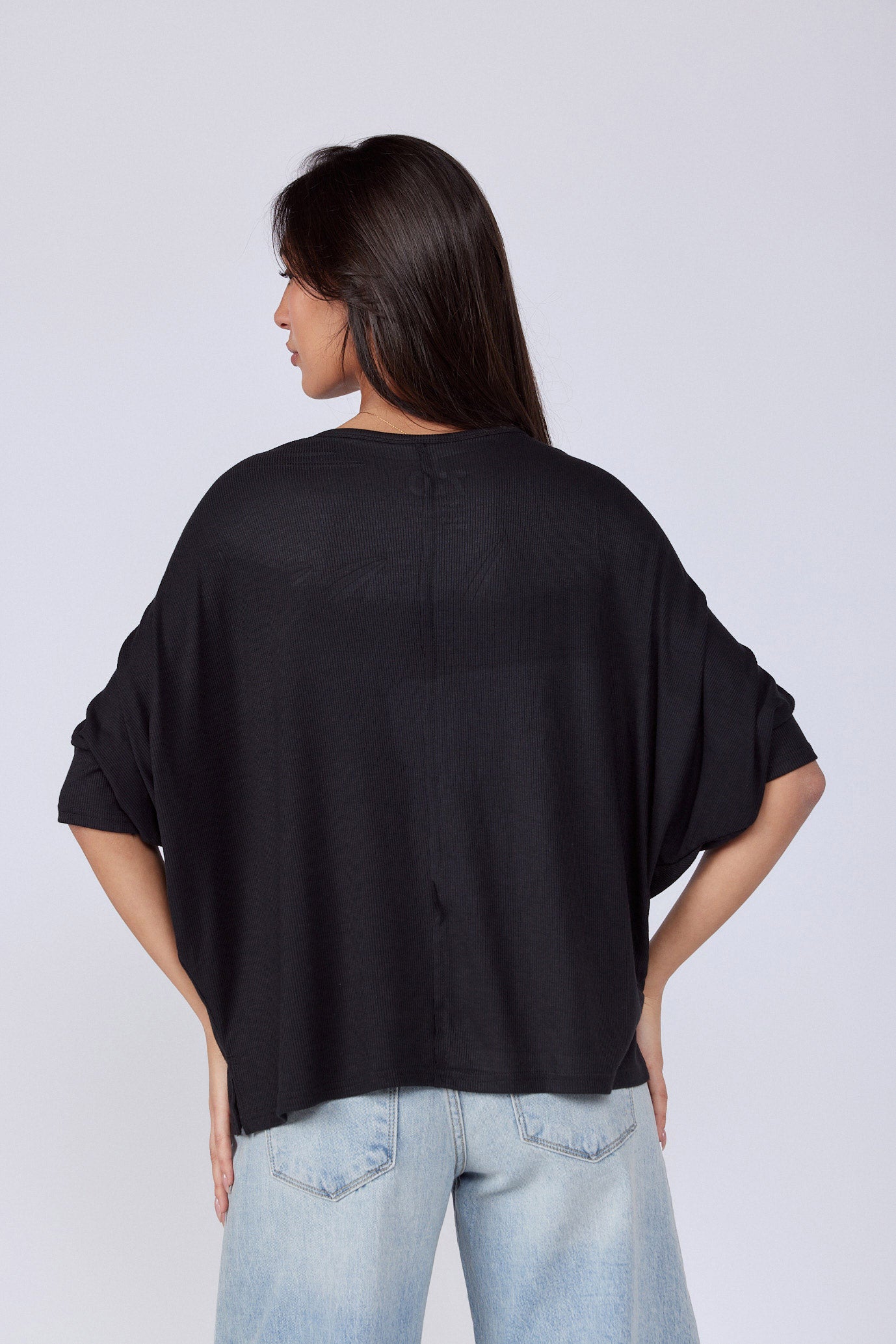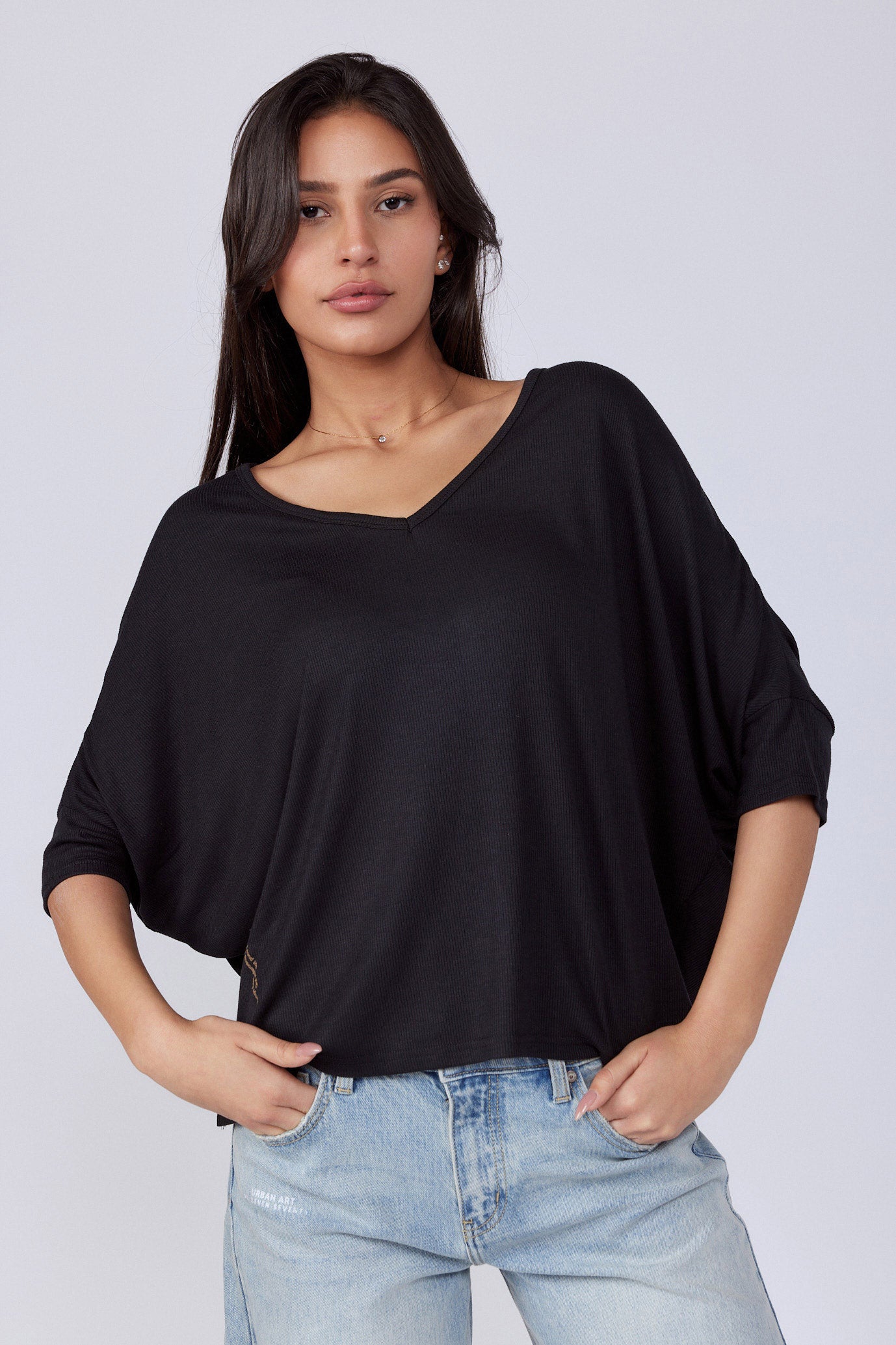 חולצה בגזרה רחבה מיוחדת בד ריב נעים ללבישה גמיש ונמתח גזרת עטלף צווארון וי גזרה רחבה ONESIZE היקף חזה בס"מ 154