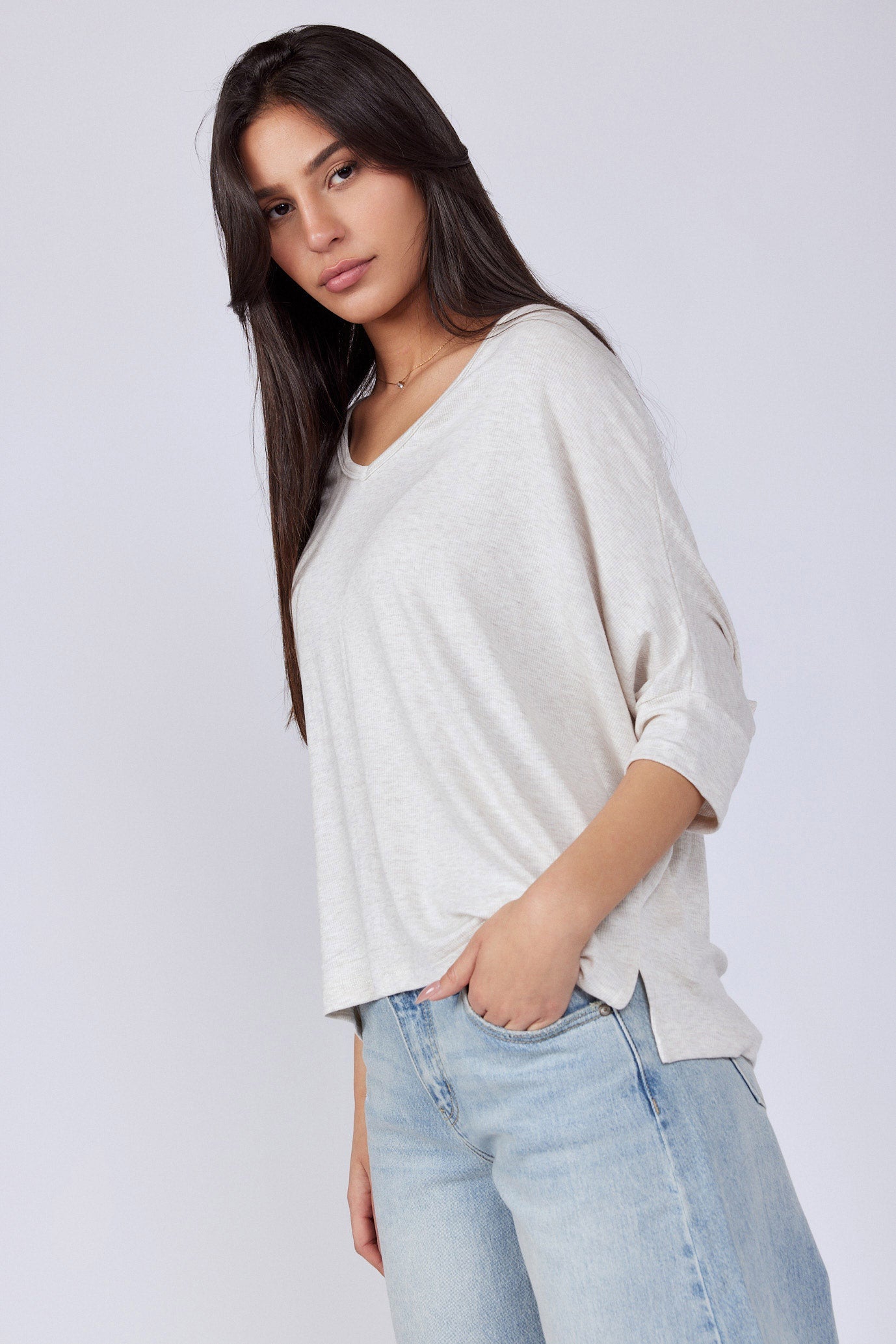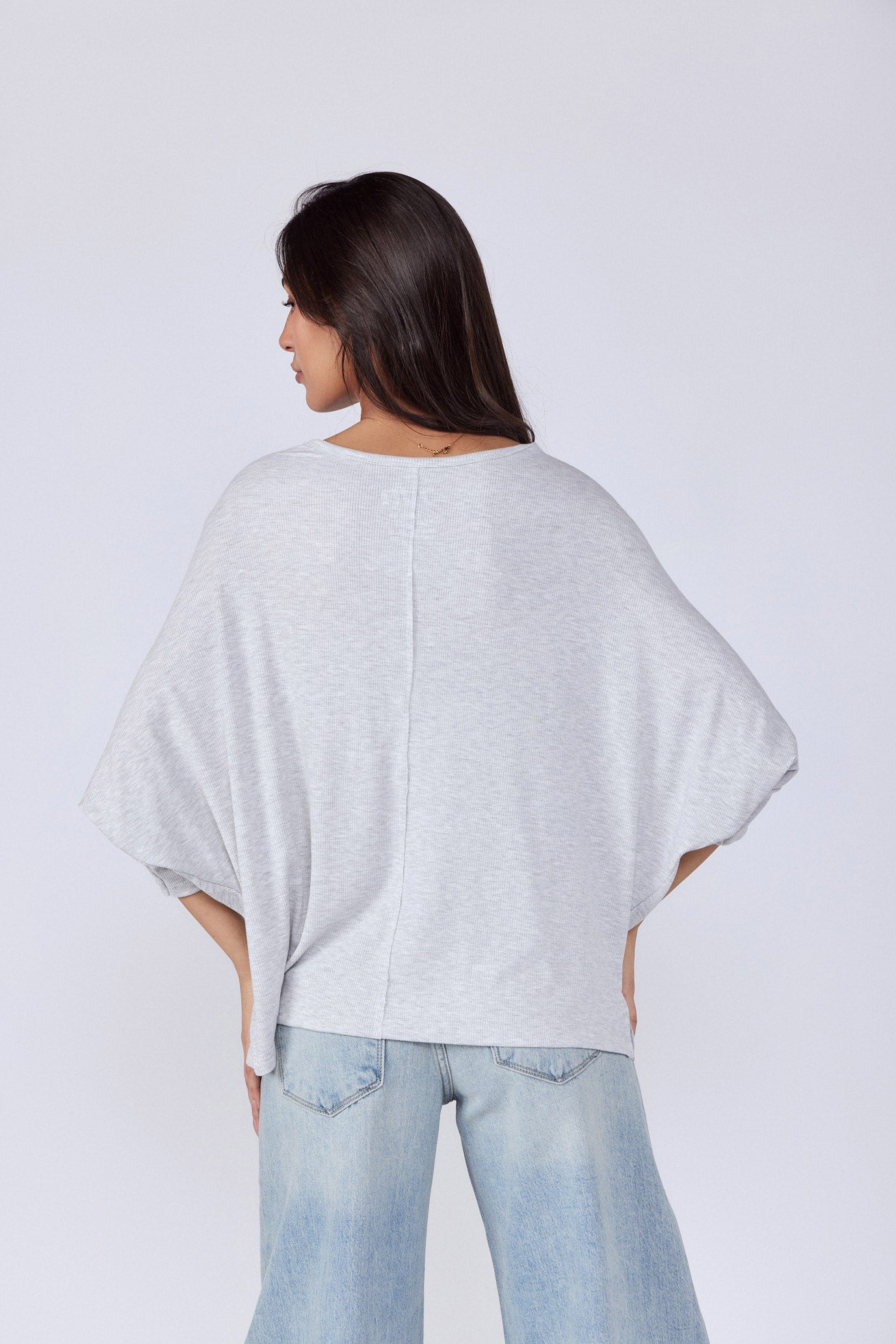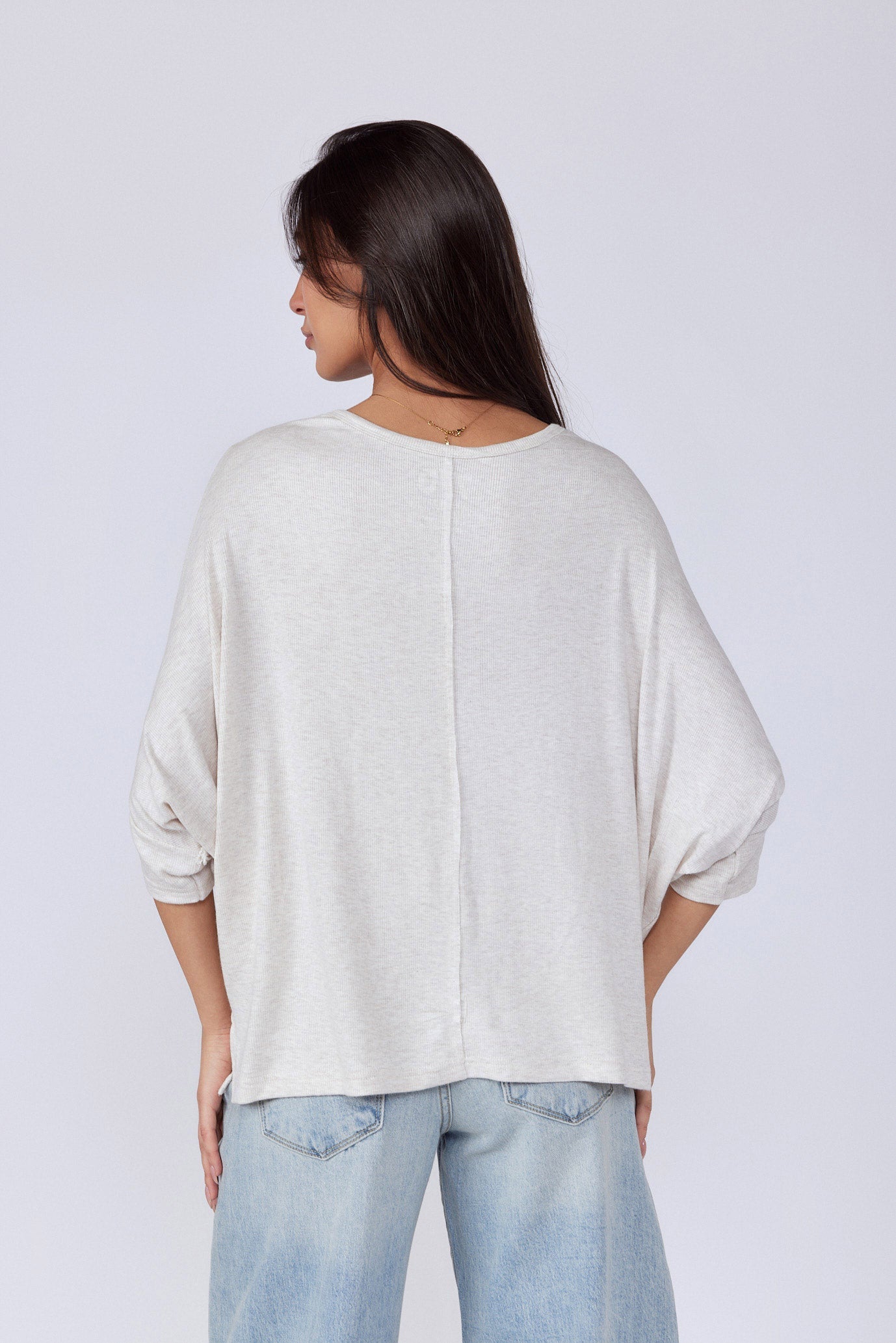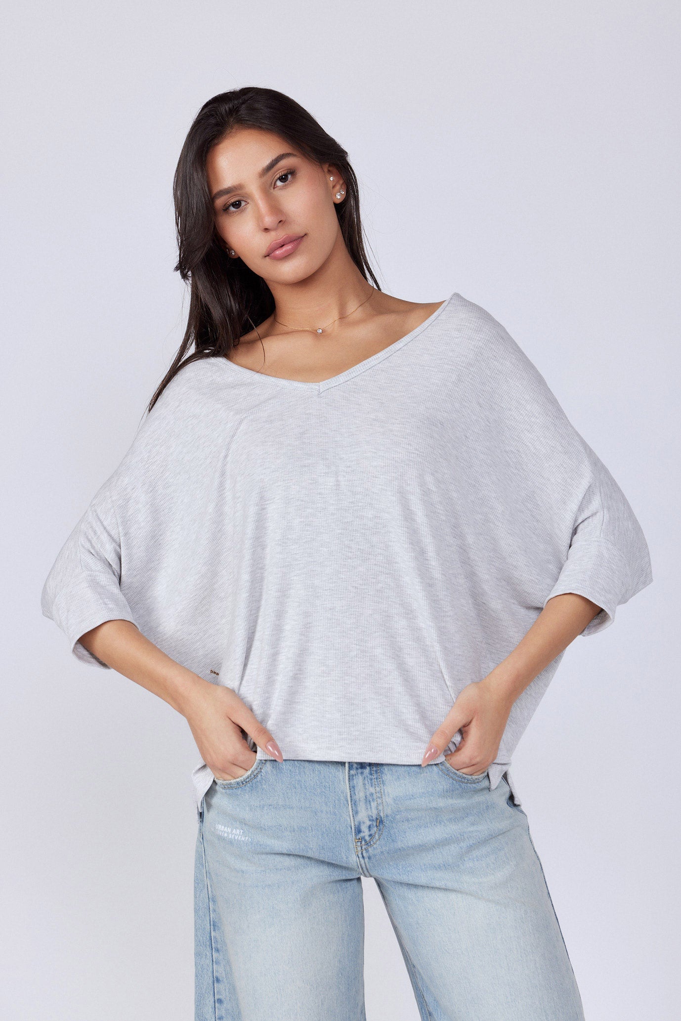 חולצה בגזרה רחבה מיוחדת בד ריב נעים ללבישה גמיש ונמתח גזרת עטלף צווארון וי גזרה רחבה ONESIZE היקף חזה בס"מ 154