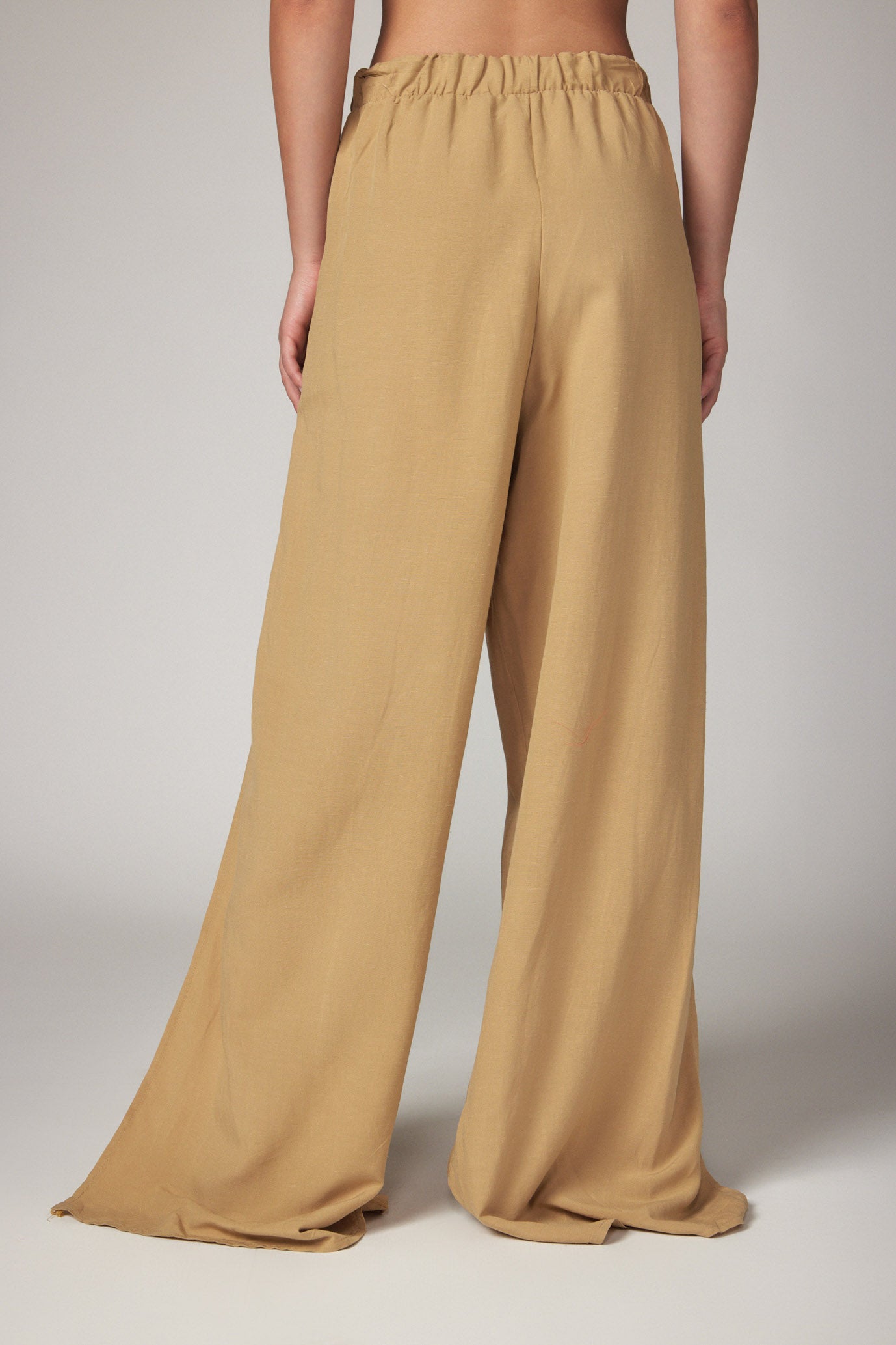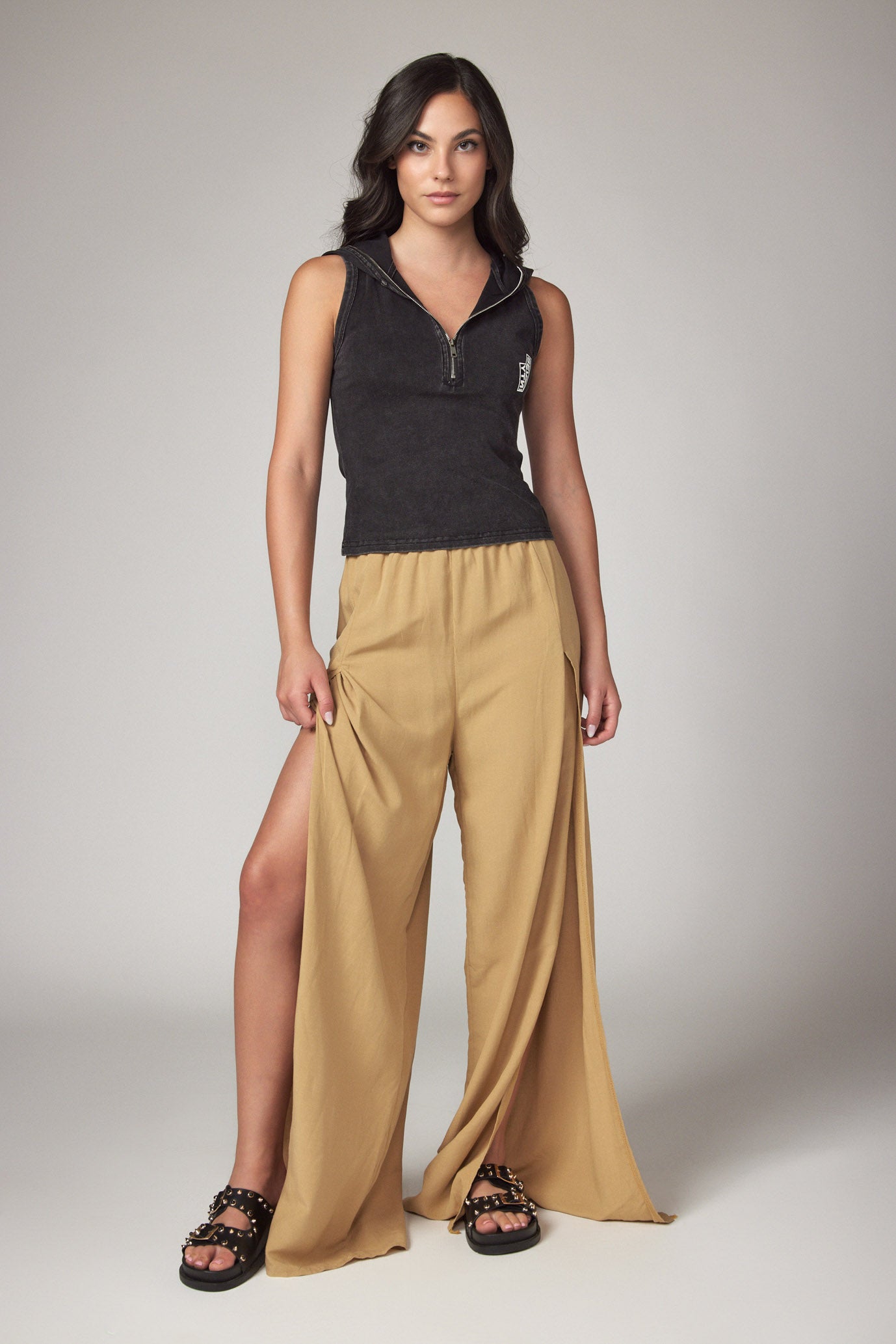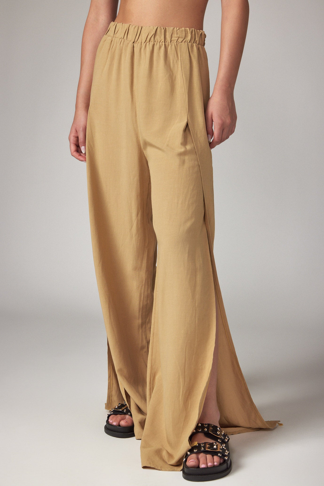 מכנסיים בגזרה מיוחדת גזרה עם פתח צד מתרחבת בד כותנה עם ויסקוזה גומי אלסטי במותניים מידות : היקף מותניים בס"מ: S:72-90 M:72-94 L:76-102