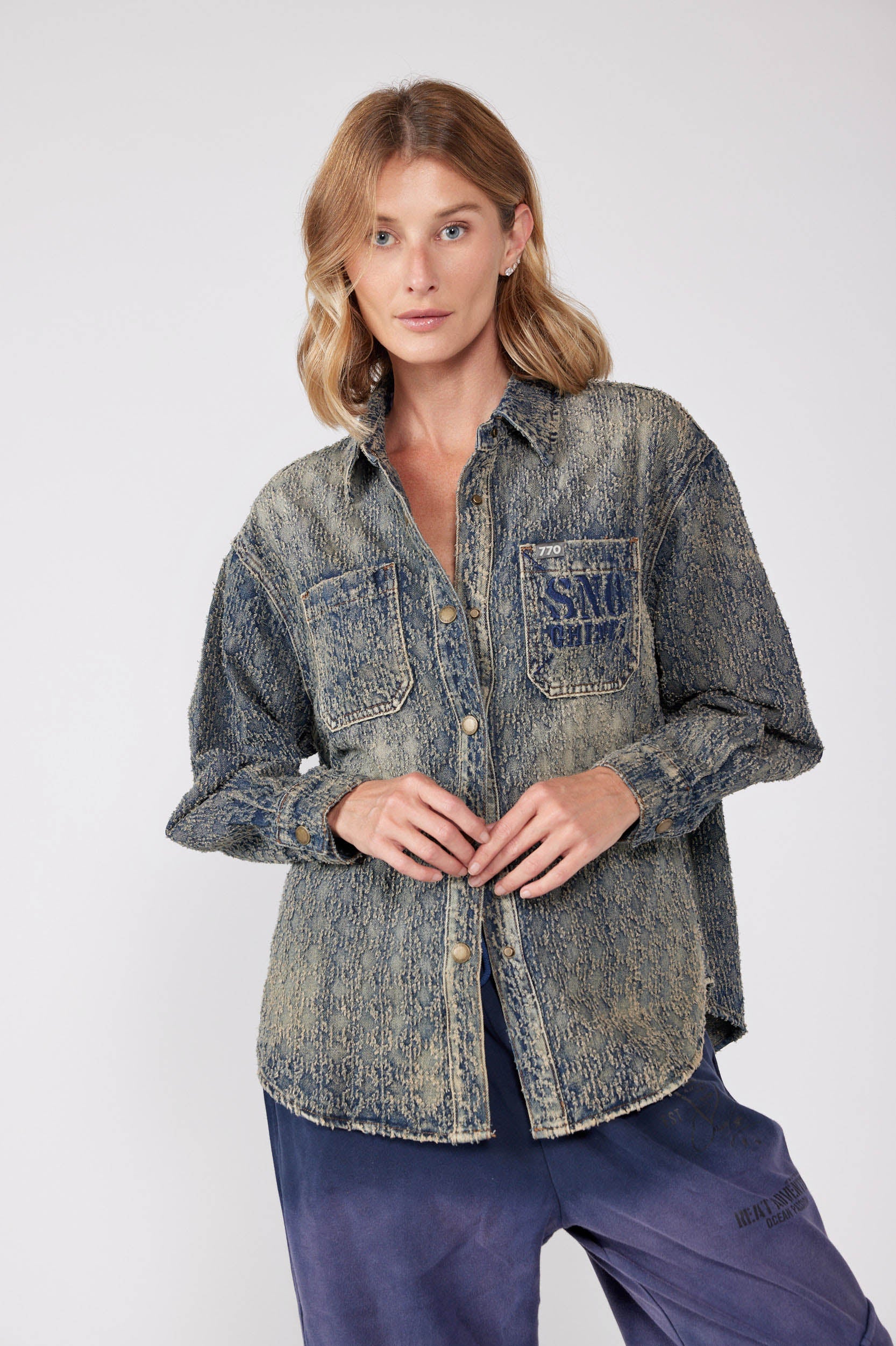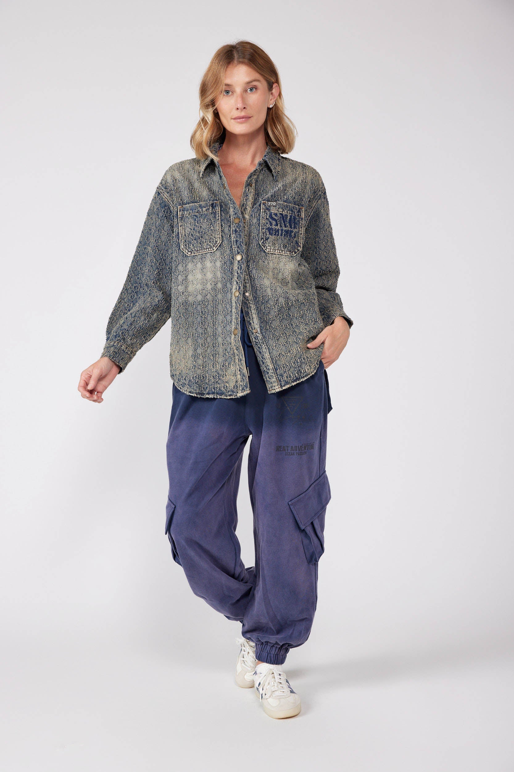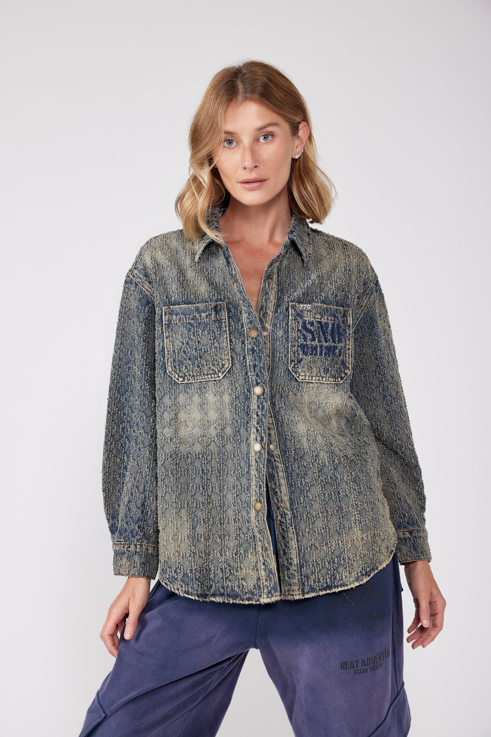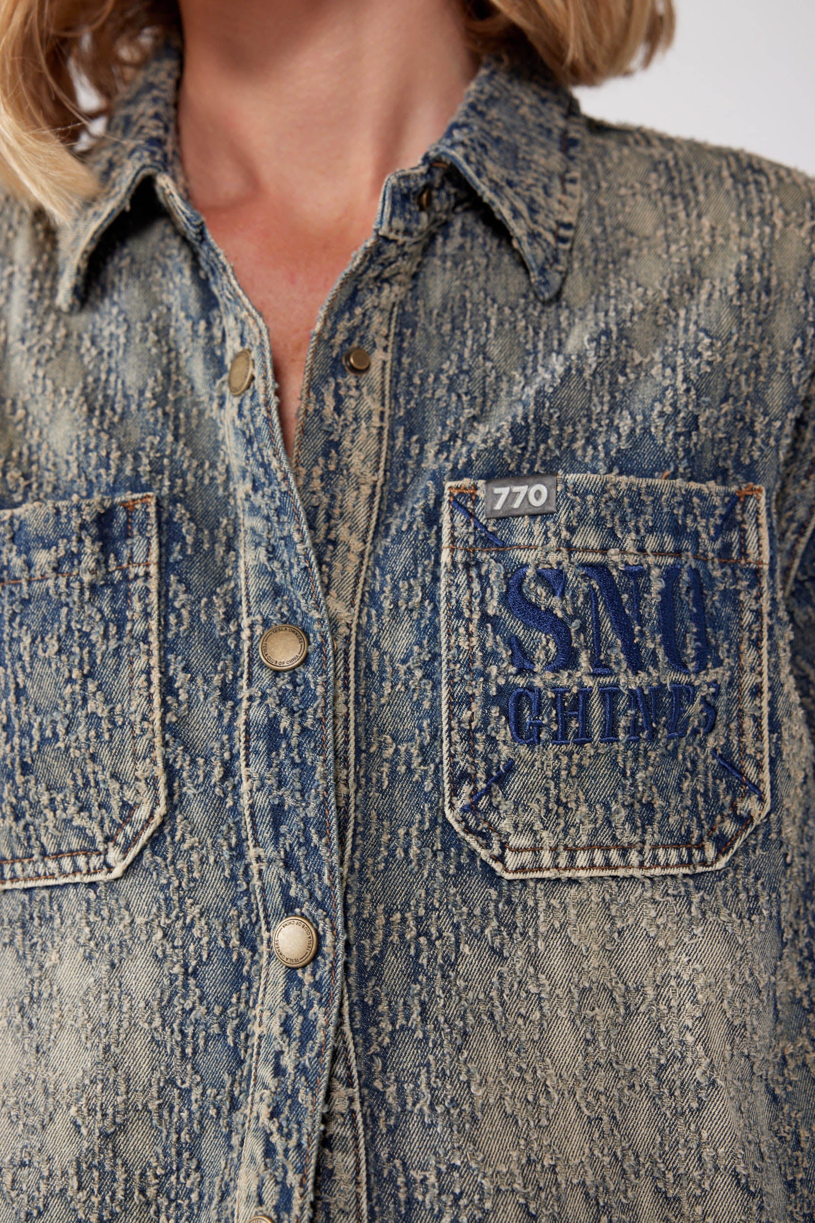 חולצה מכופתרת בד ג'ינס ווש דק במרקם דוגמא ארוגה גזרה רחבה מידות: היקף חזה בס”מ : S : 124 M: 128
