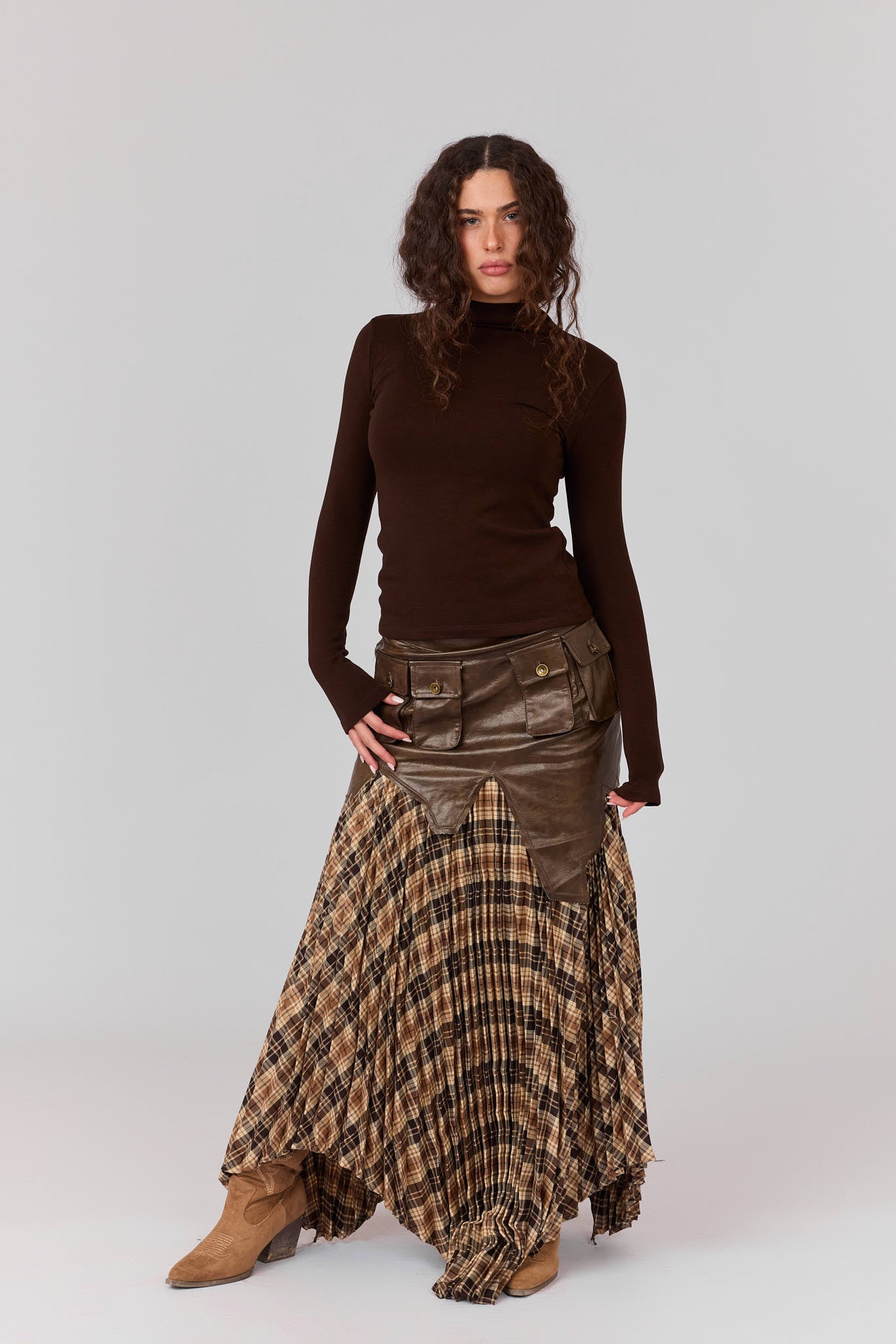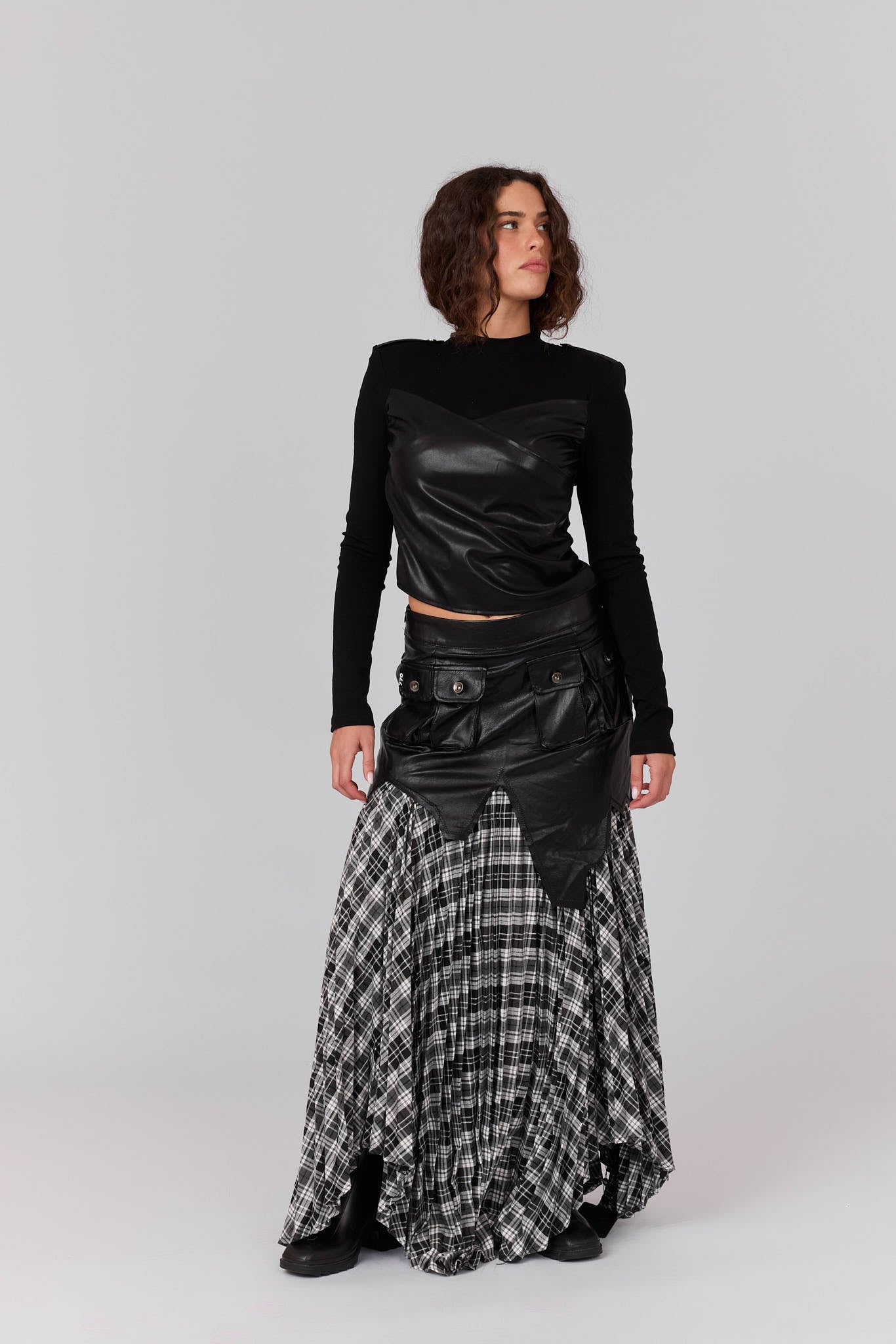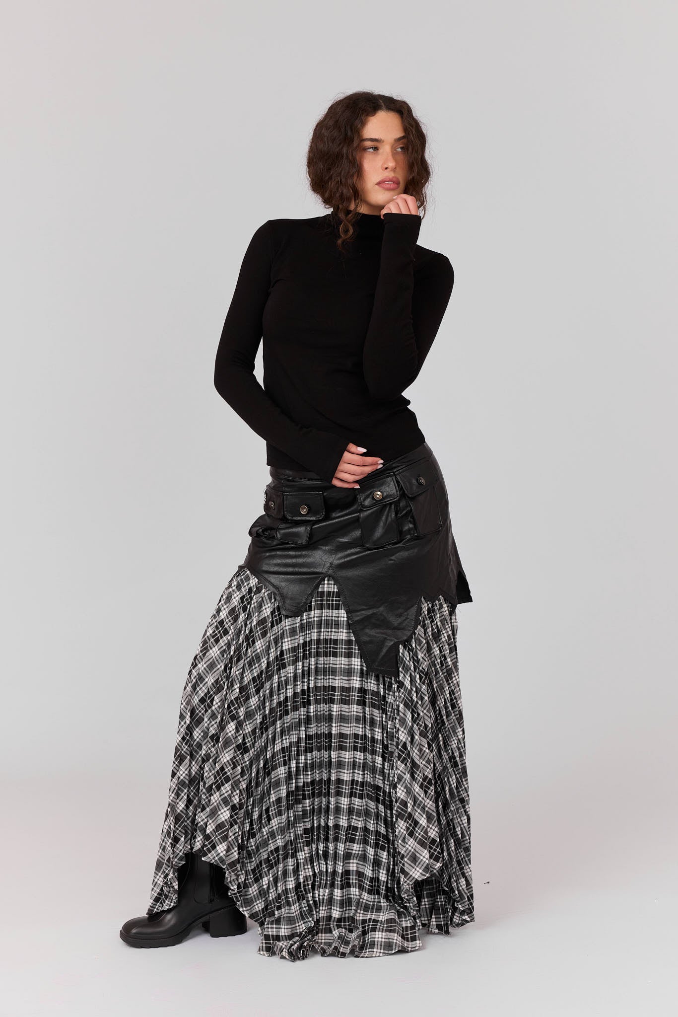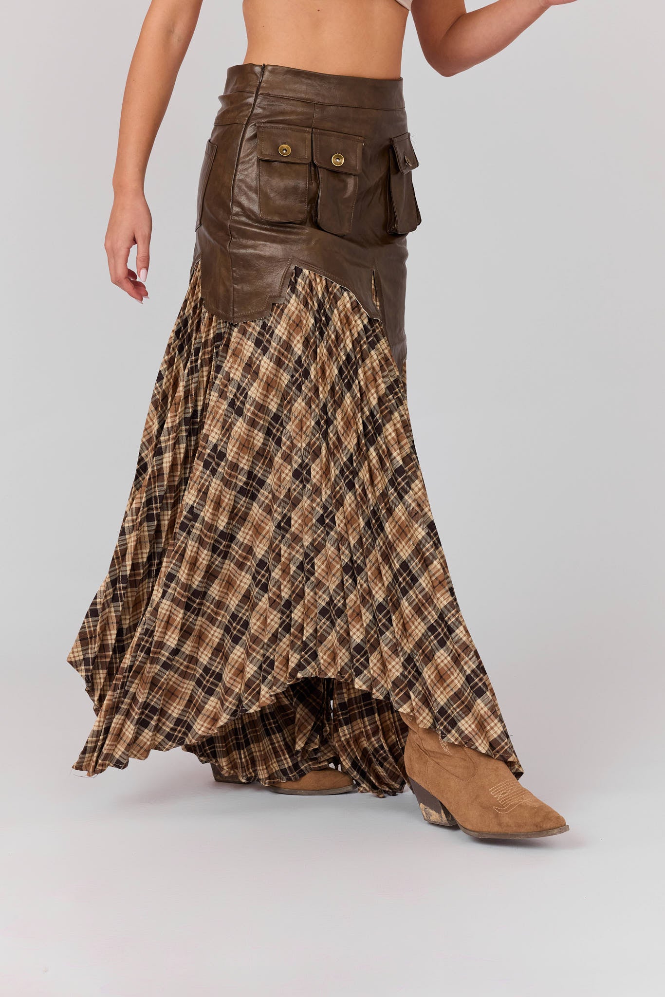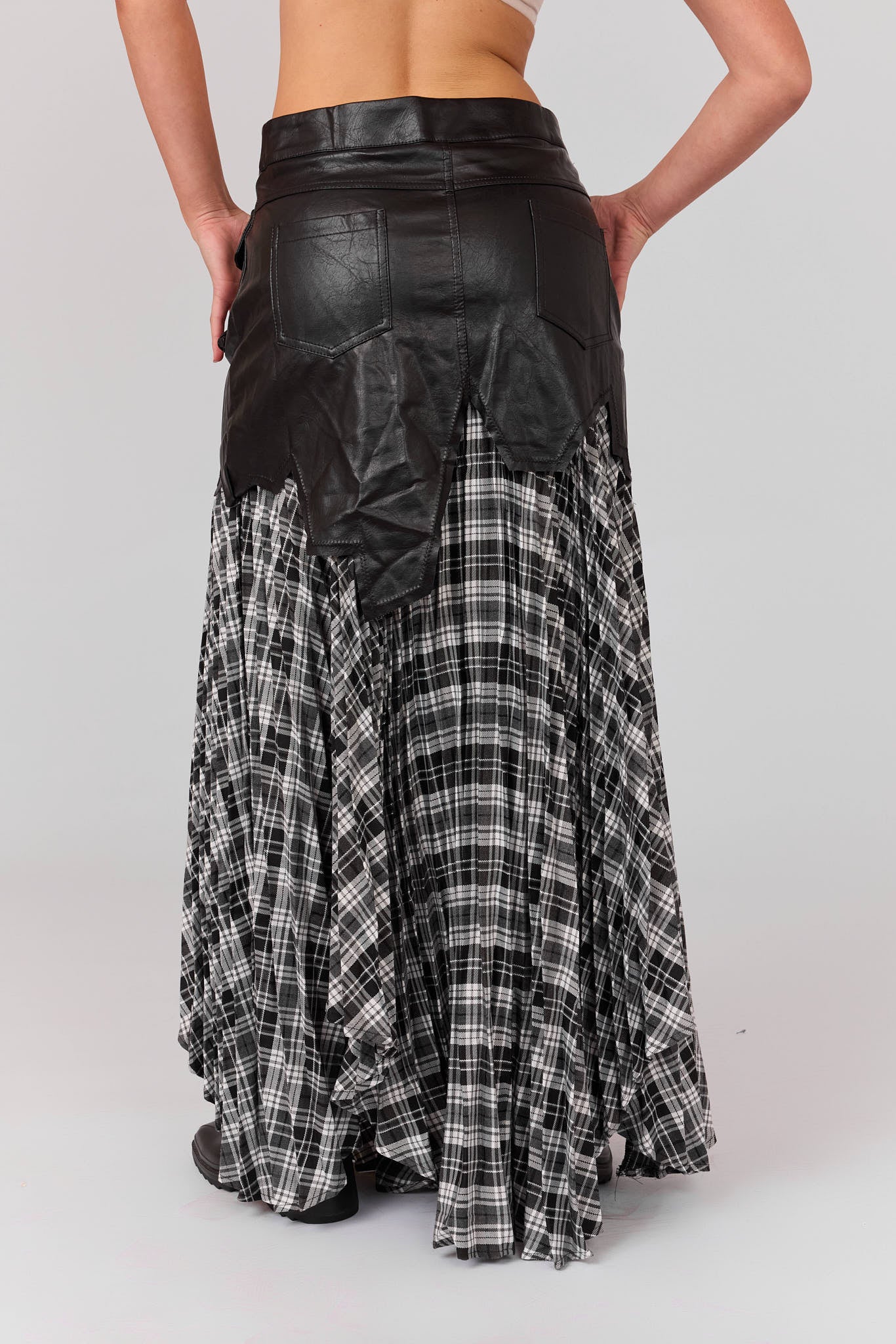 חצאית משבצות שילוב עור