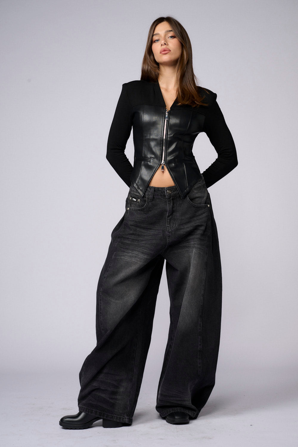חולצת רוכסן שילוב דמוי עור