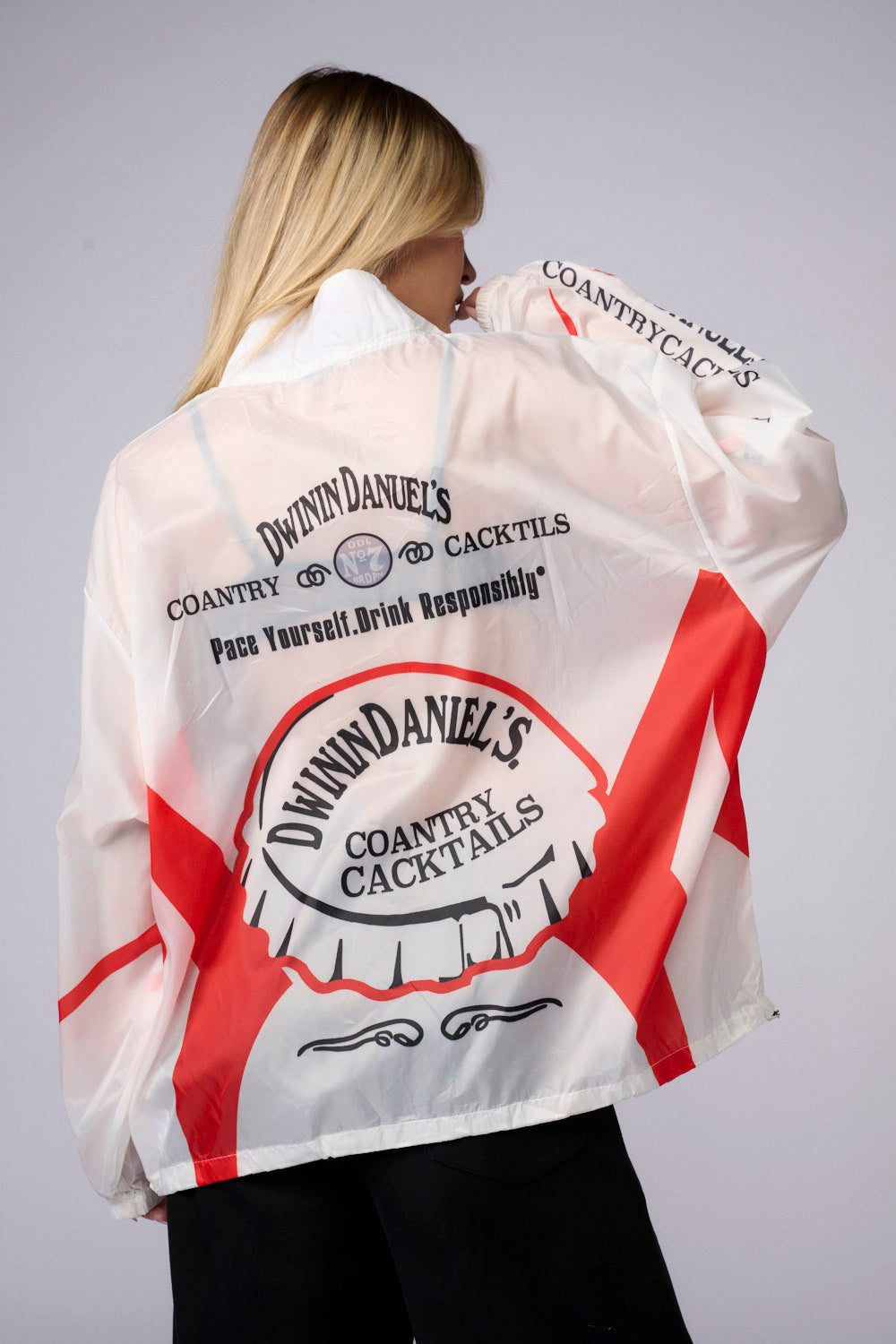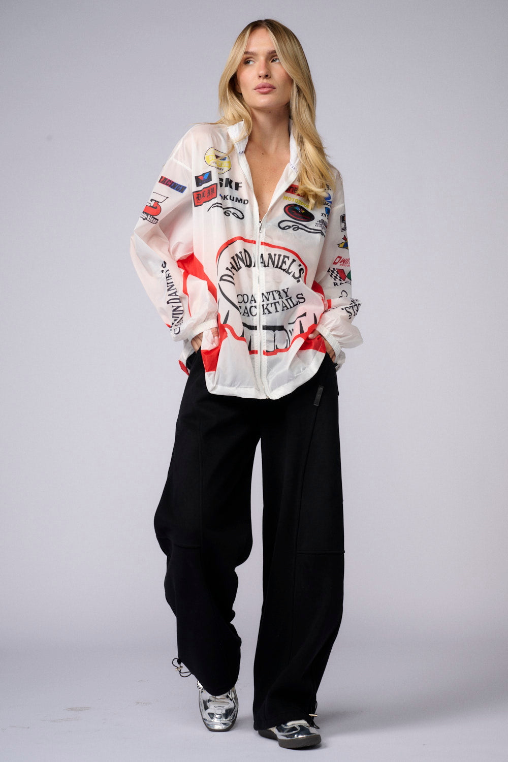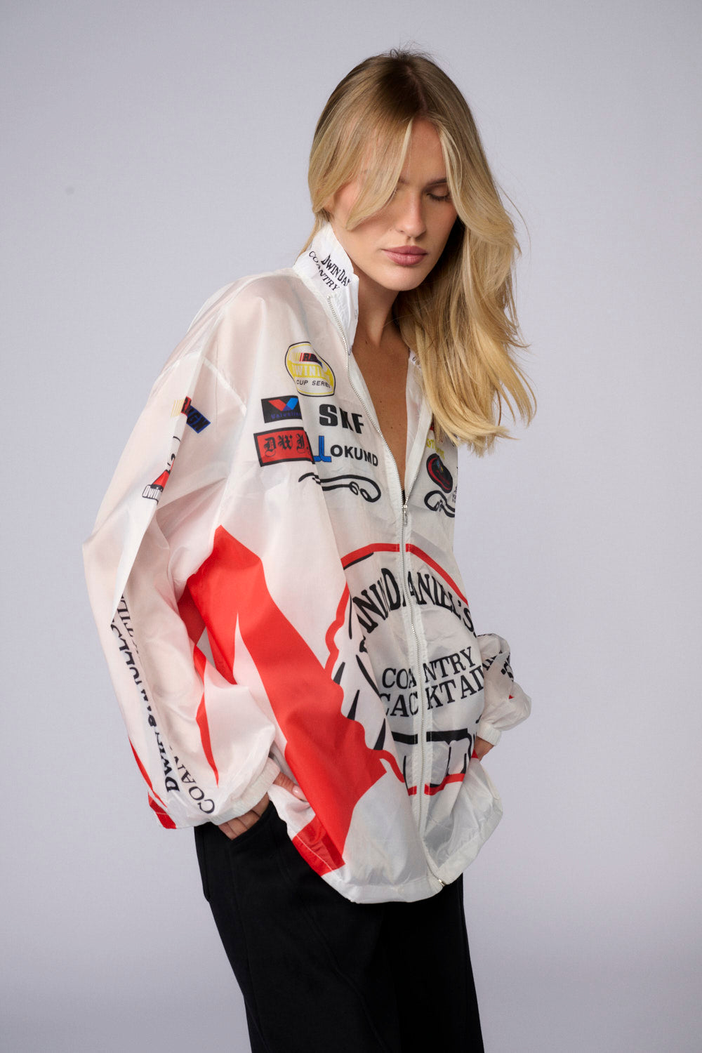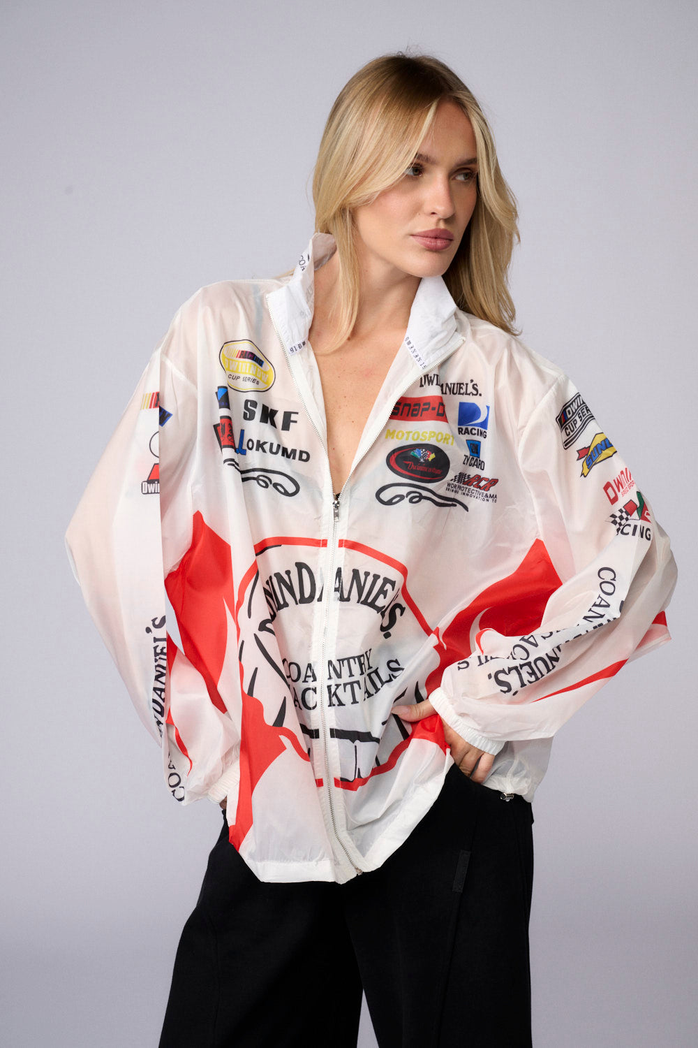 מעיל רוח חצי שקוף בעיצוב מיוחד של מרוצי מכוניות בגזרה רחבה וסגירת רוכסן.