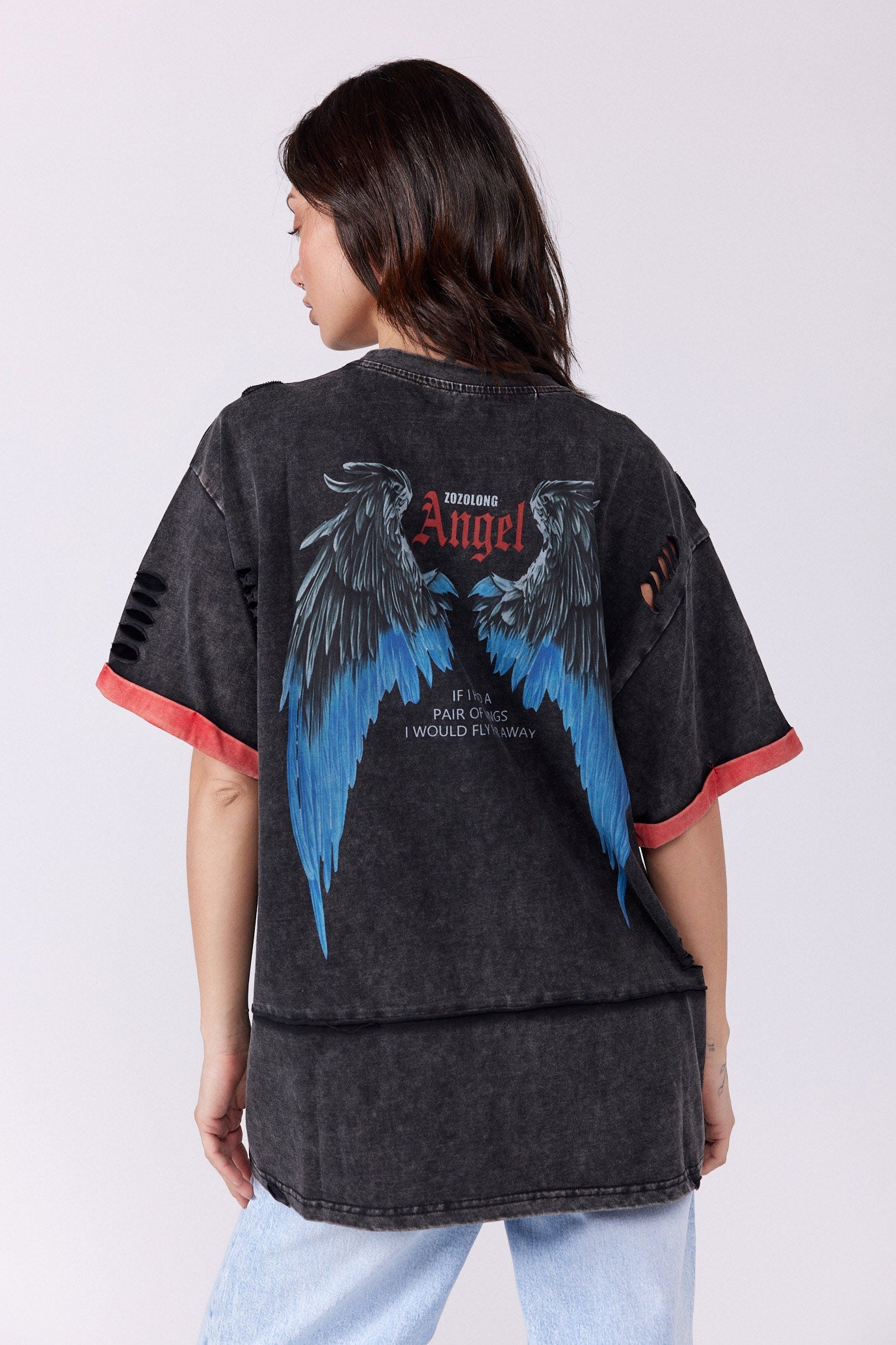 חולצת טי בגזרת קרעים מיוחדת קפל בשרוול בד טריקו איכותי גזרה רחבה ONESIZE היקף חזה בס"מ 126
