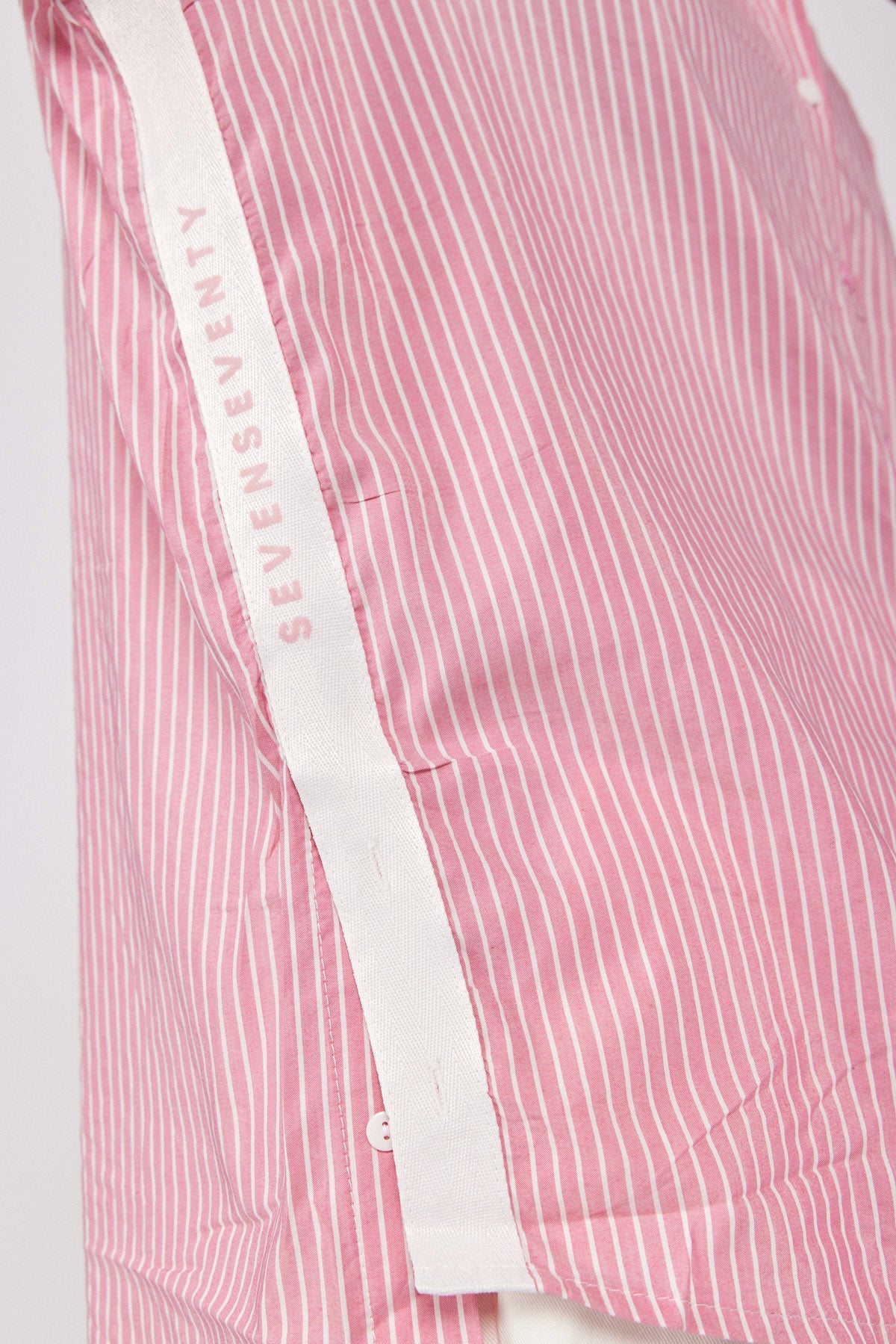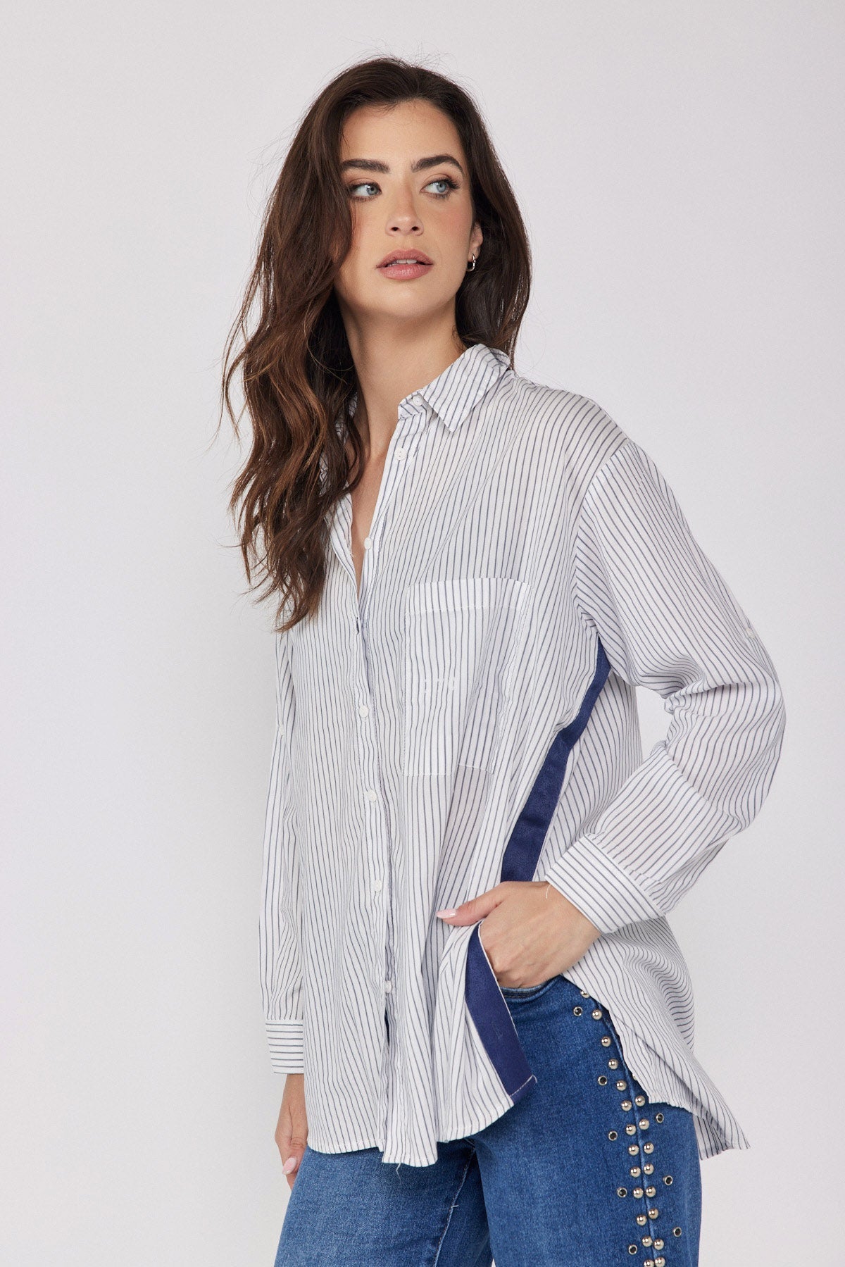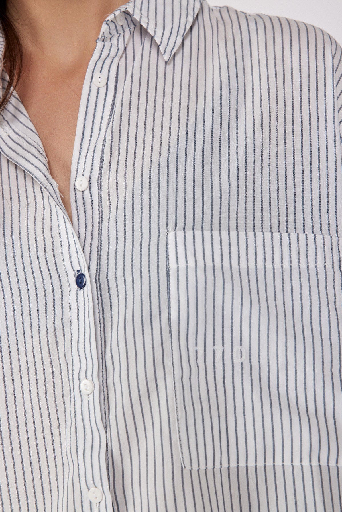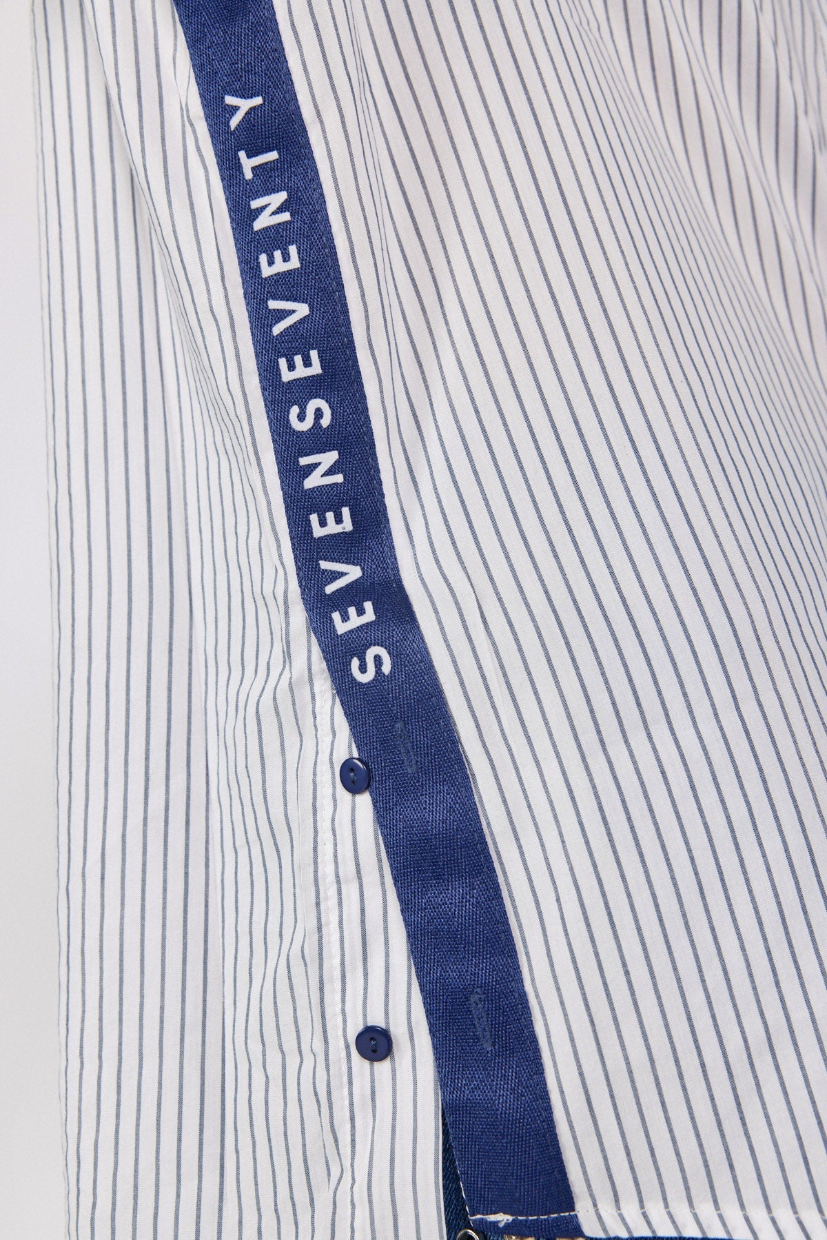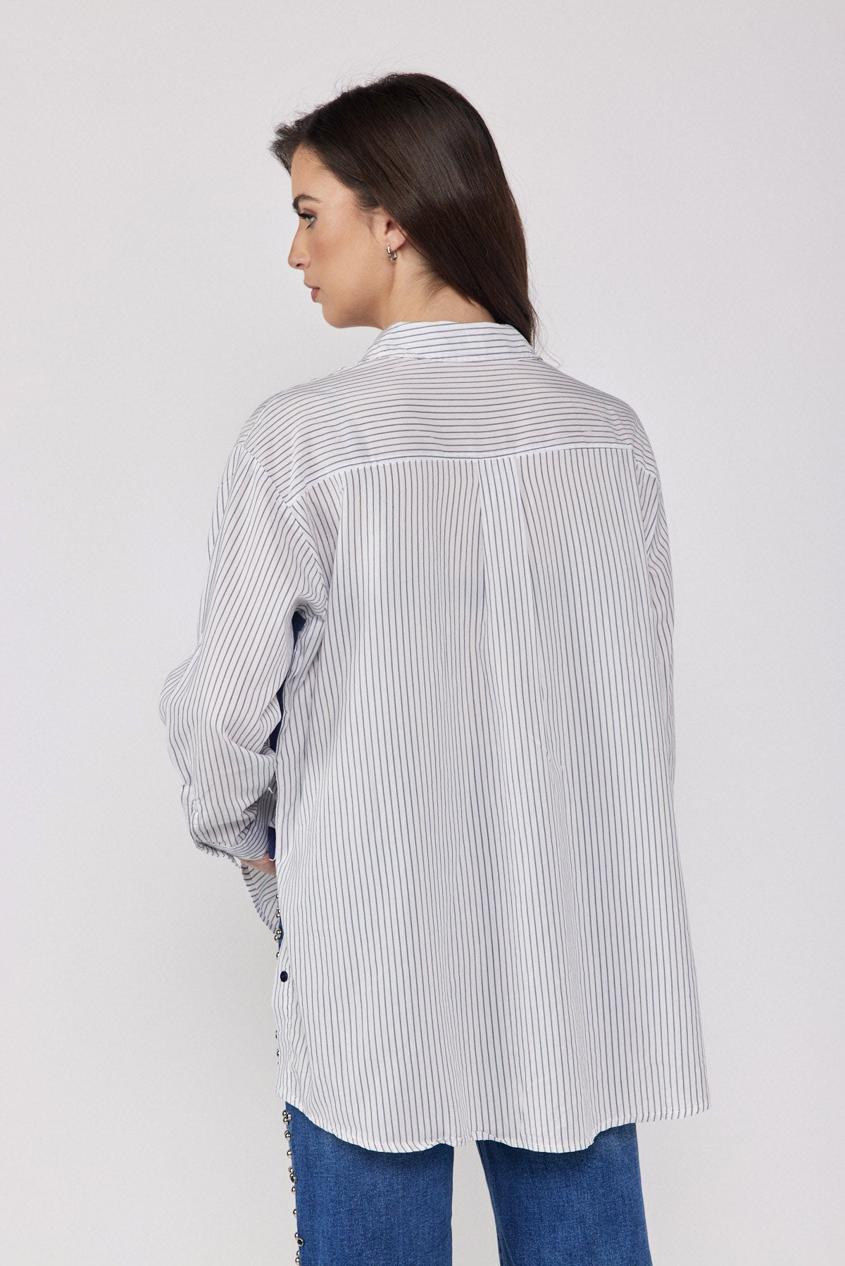 Striped shirt with a special design Cotton fabric with a bit of satin is light and very pleasant to the touch. Long front back cut Openings on the sides of the shirt with button closure Wide cut Dimensions: Chest circumference in cm S: 126 M: 130 L : 136