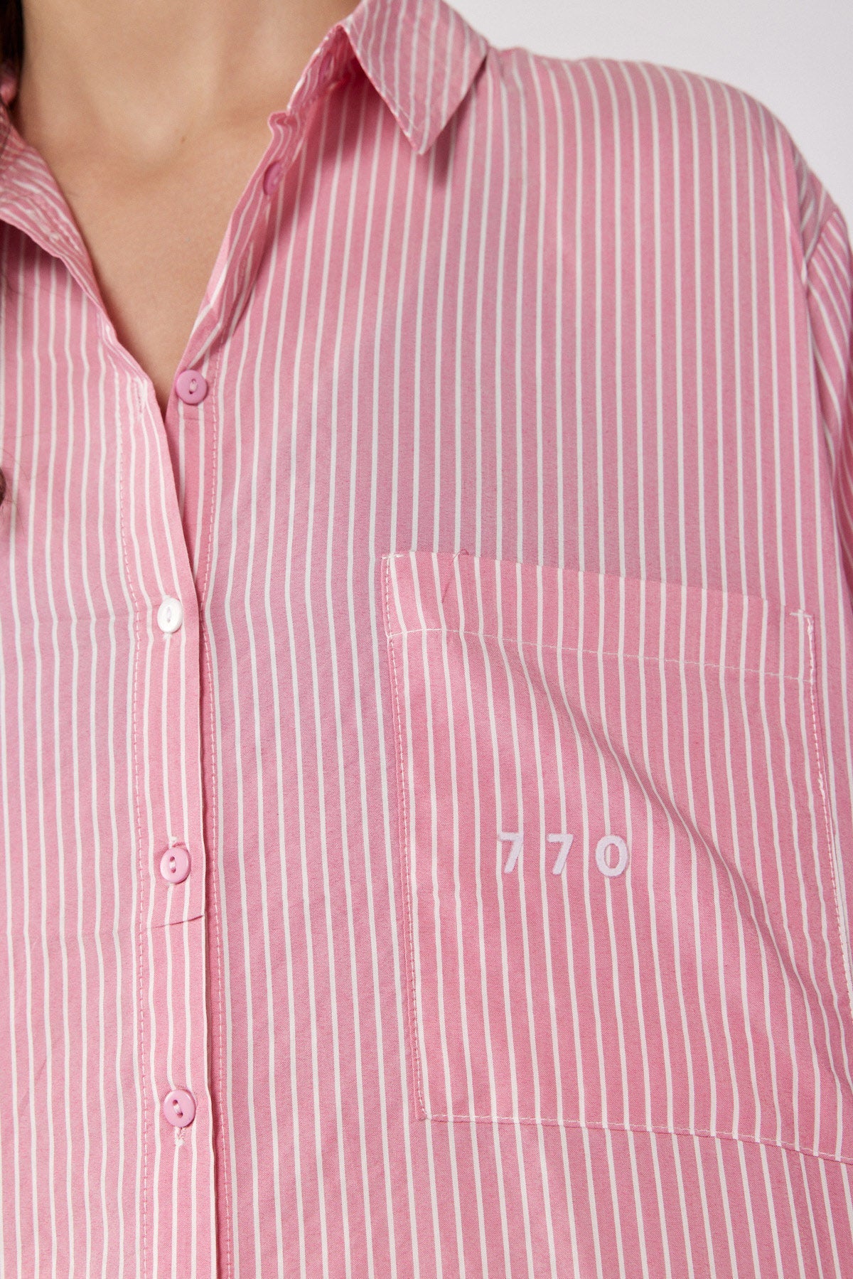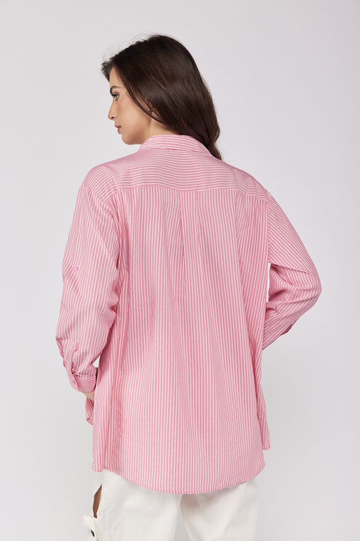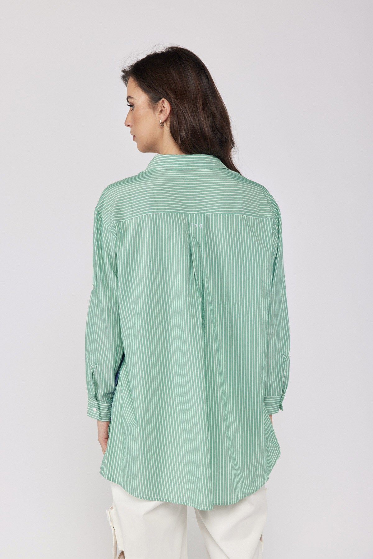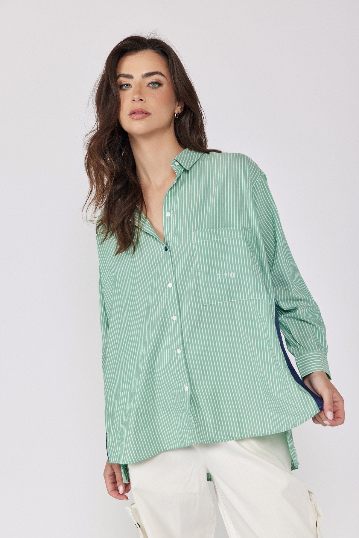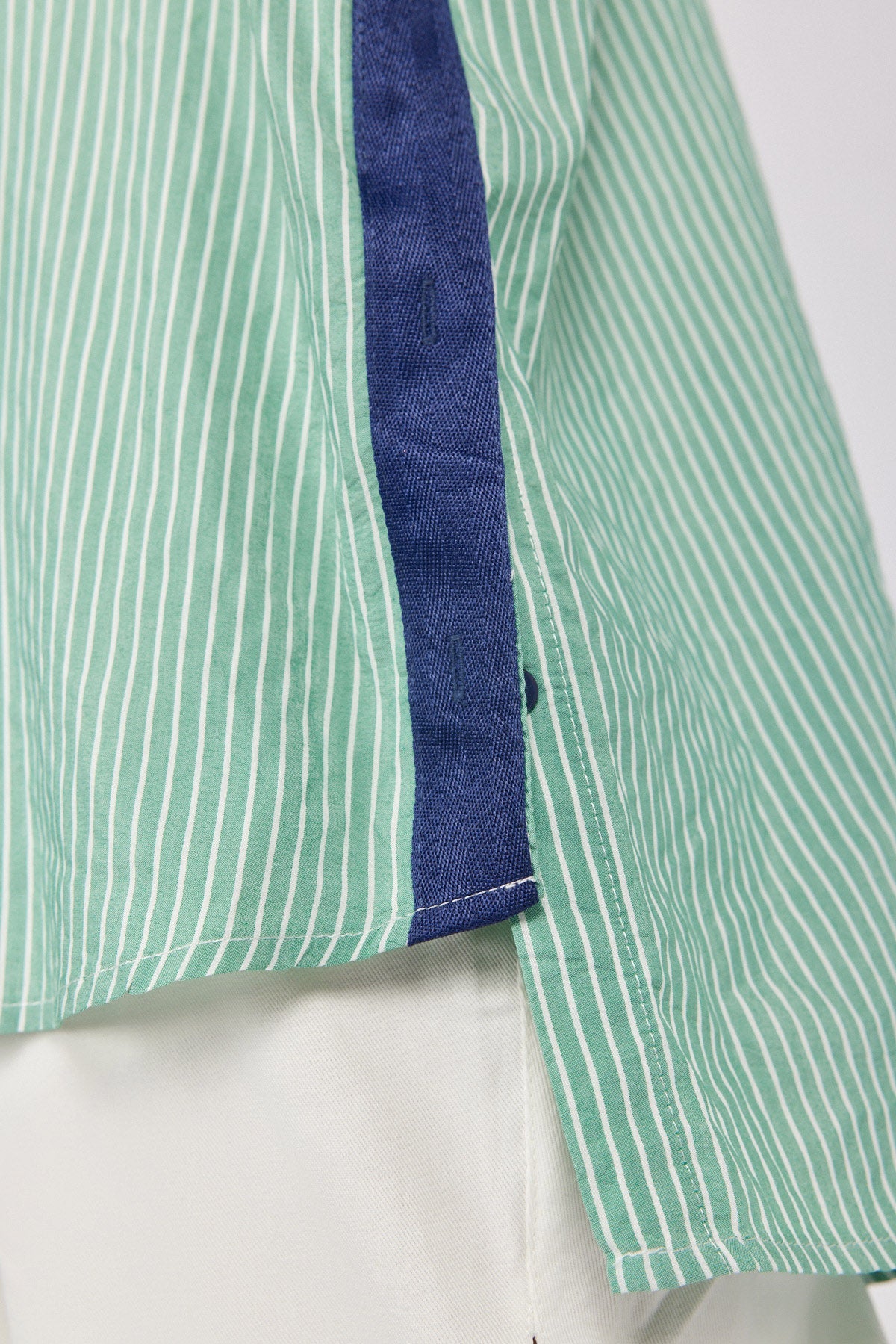 Striped shirt with a special design Cotton fabric with a bit of satin is light and very pleasant to the touch. Long front back cut Openings on the sides of the shirt with button closure Wide cut Dimensions: Chest circumference in cm S: 126 M: 130 L : 136