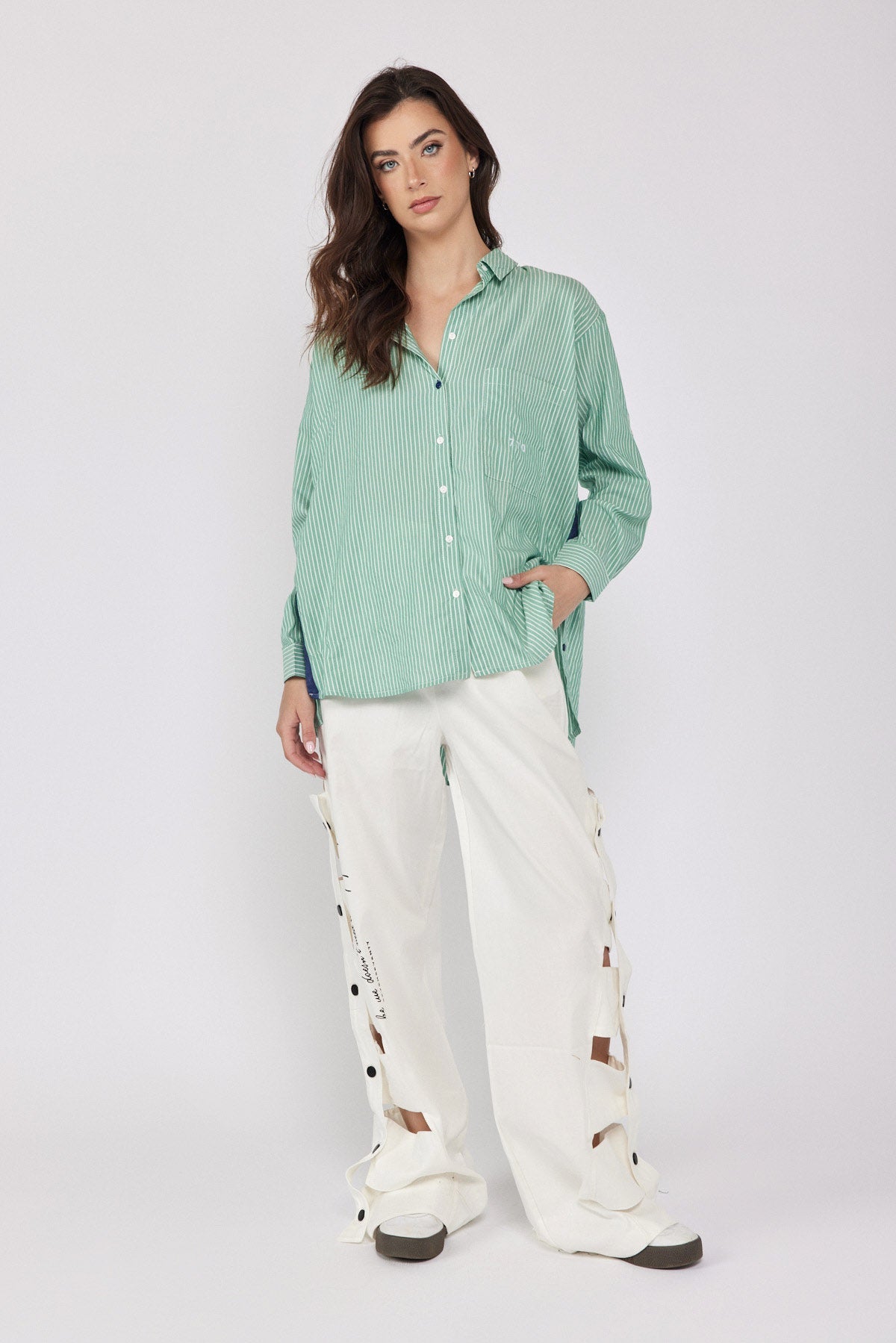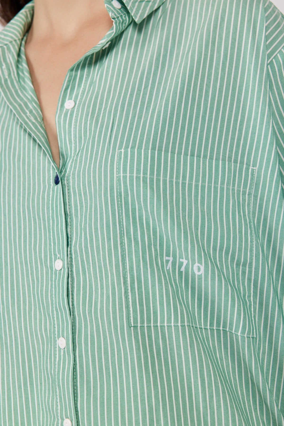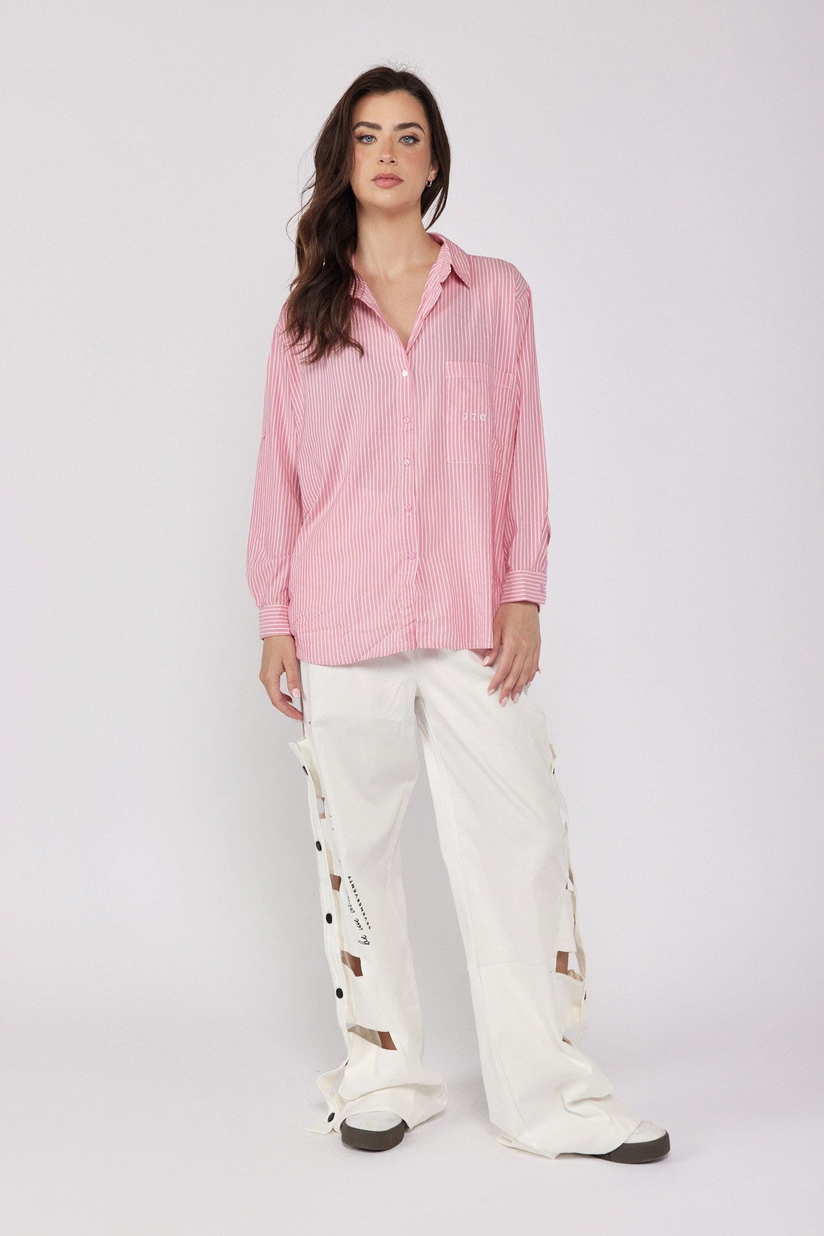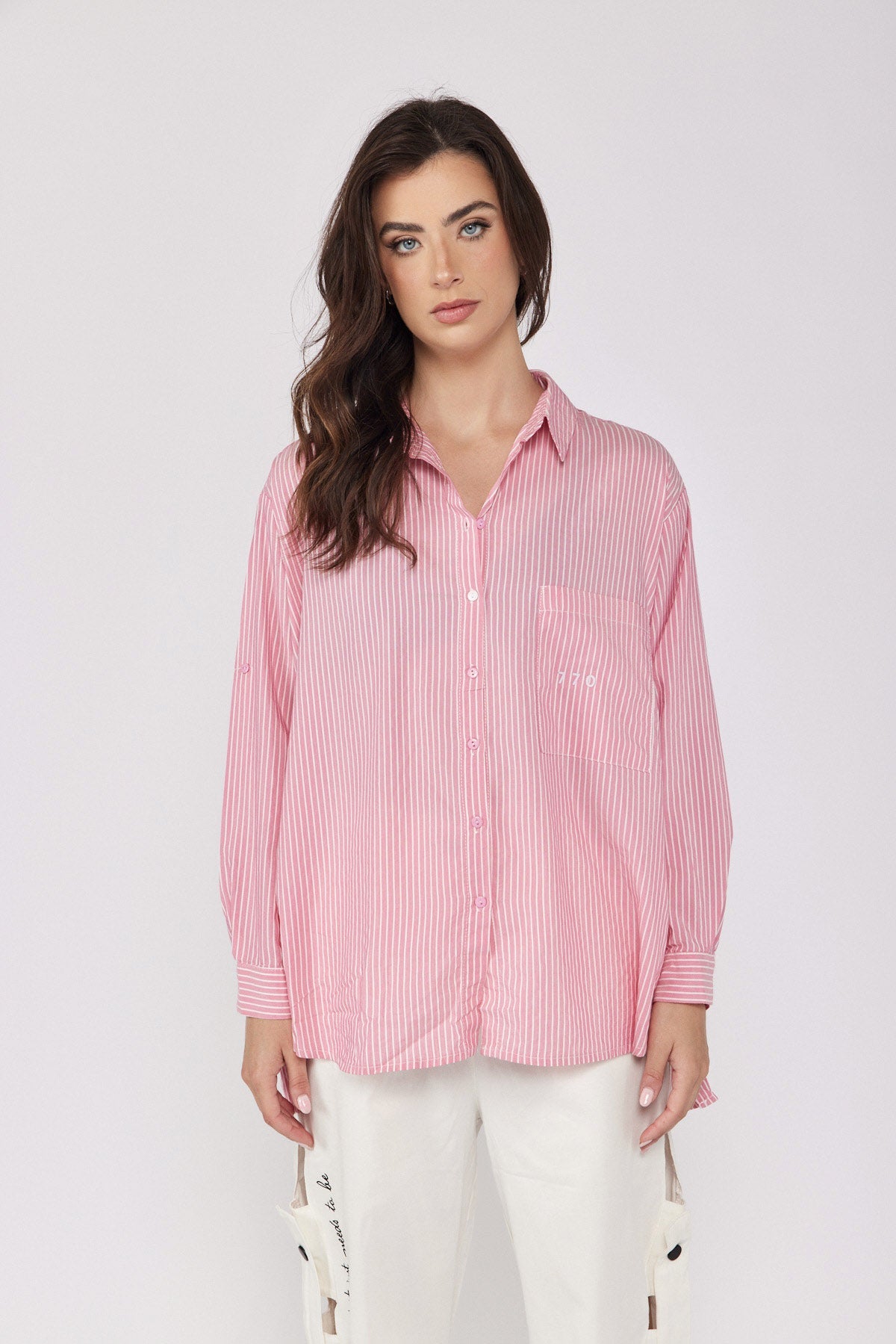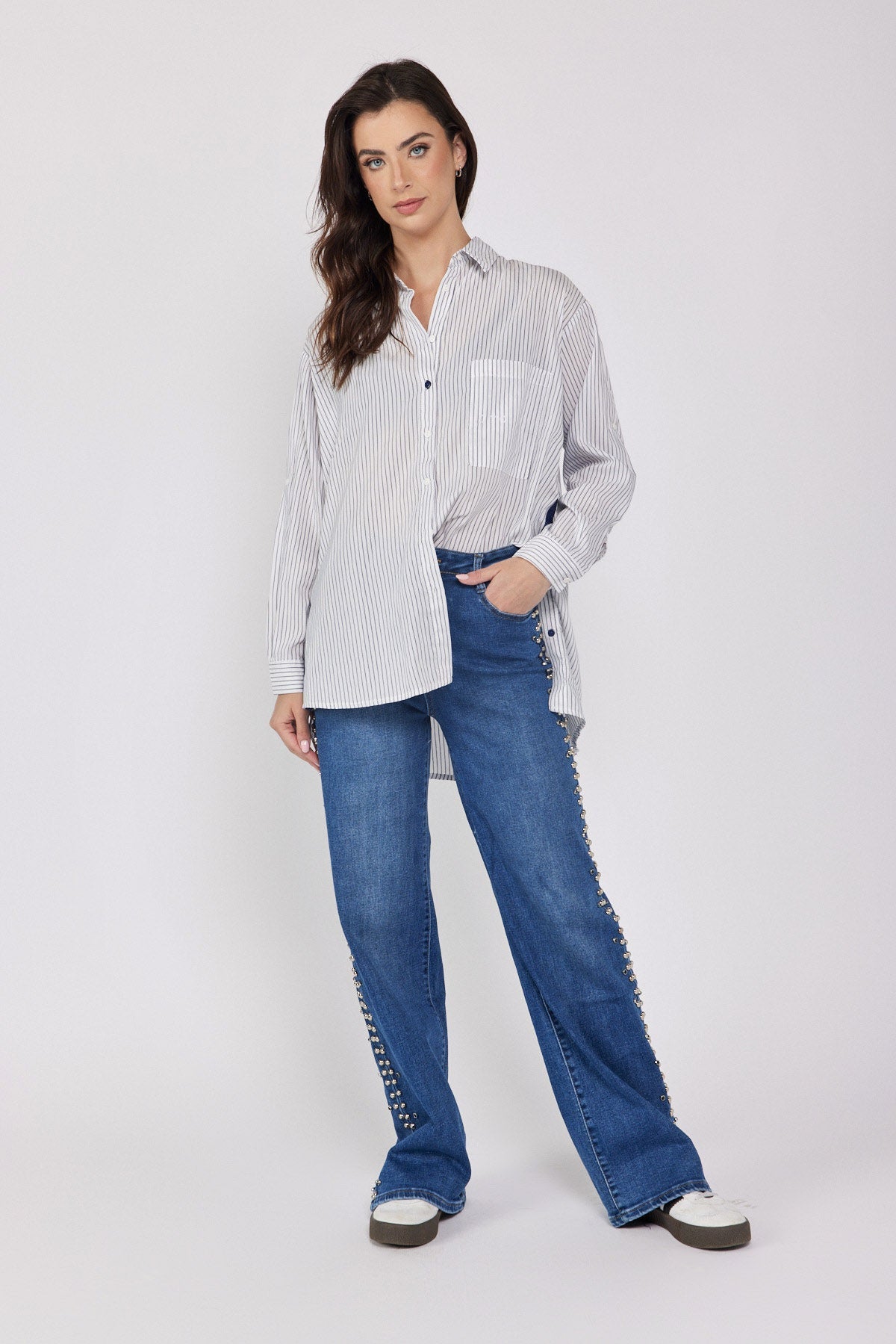 Striped shirt with a special design Cotton fabric with a bit of satin is light and very pleasant to the touch. Long front back cut Openings on the sides of the shirt with button closure Wide cut Dimensions: Chest circumference in cm S: 126 M: 130 L : 136
