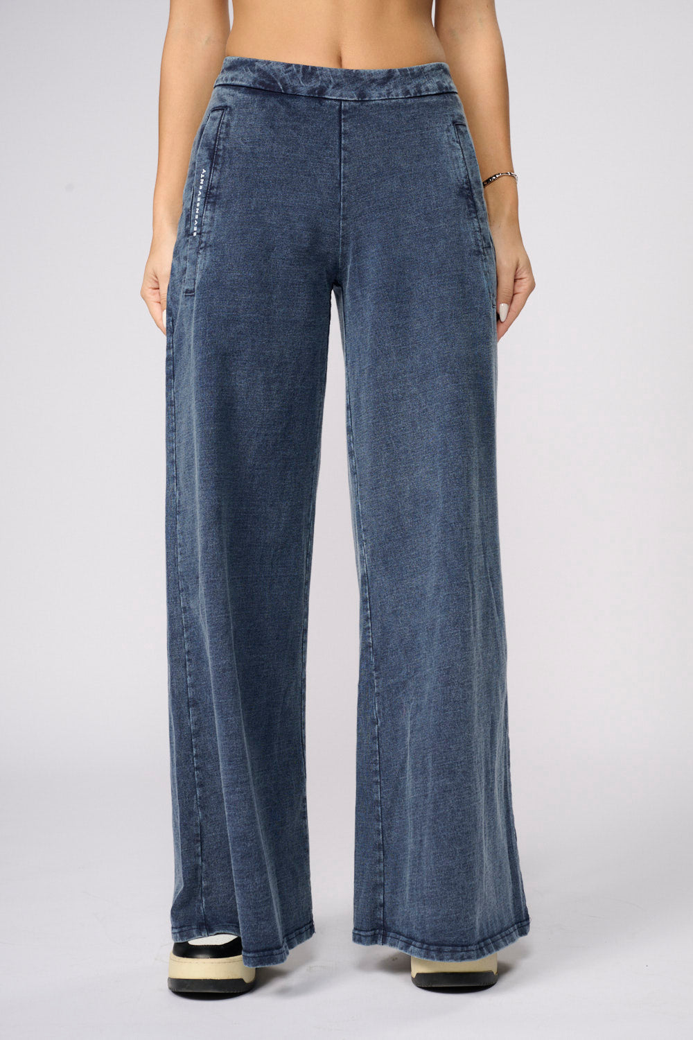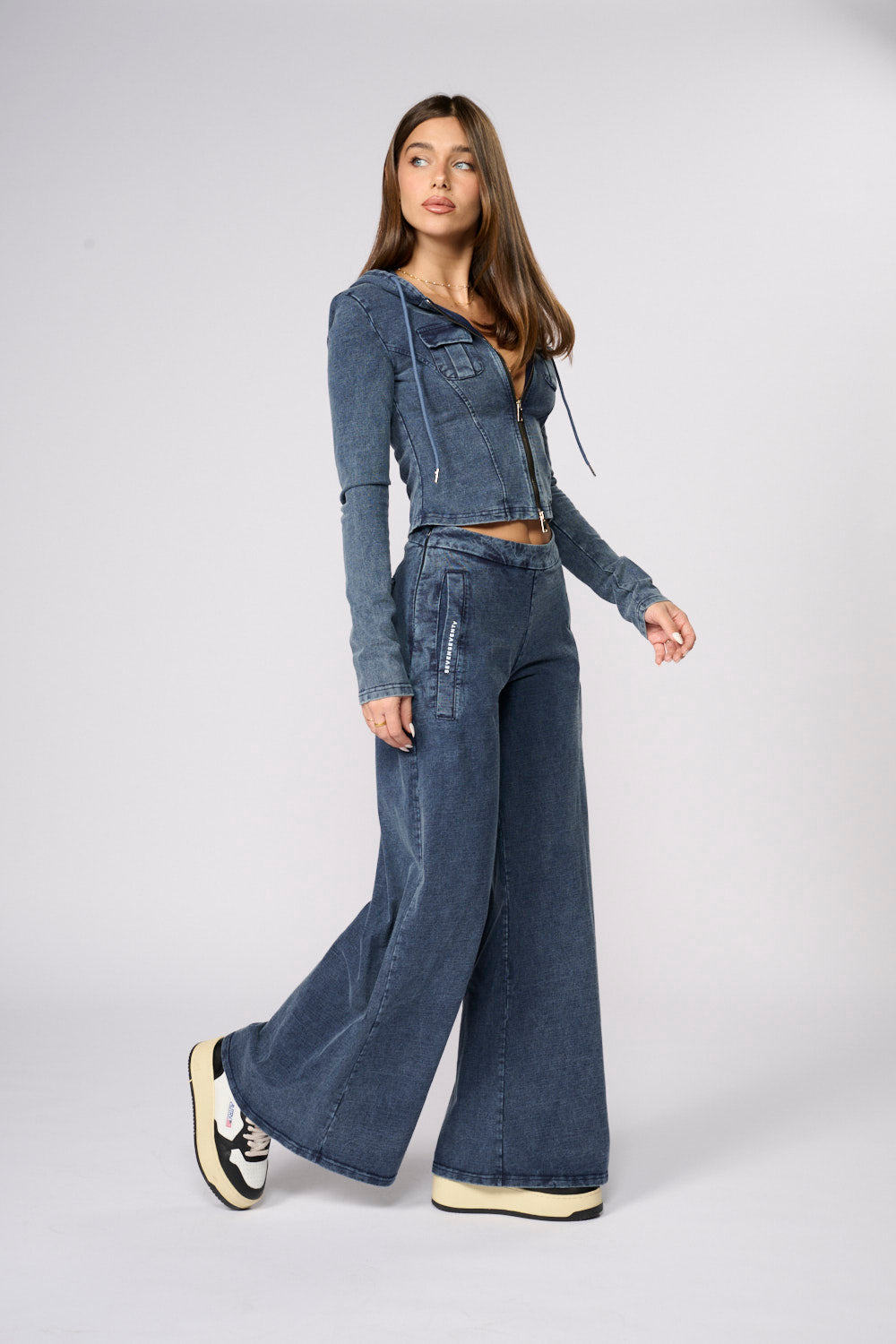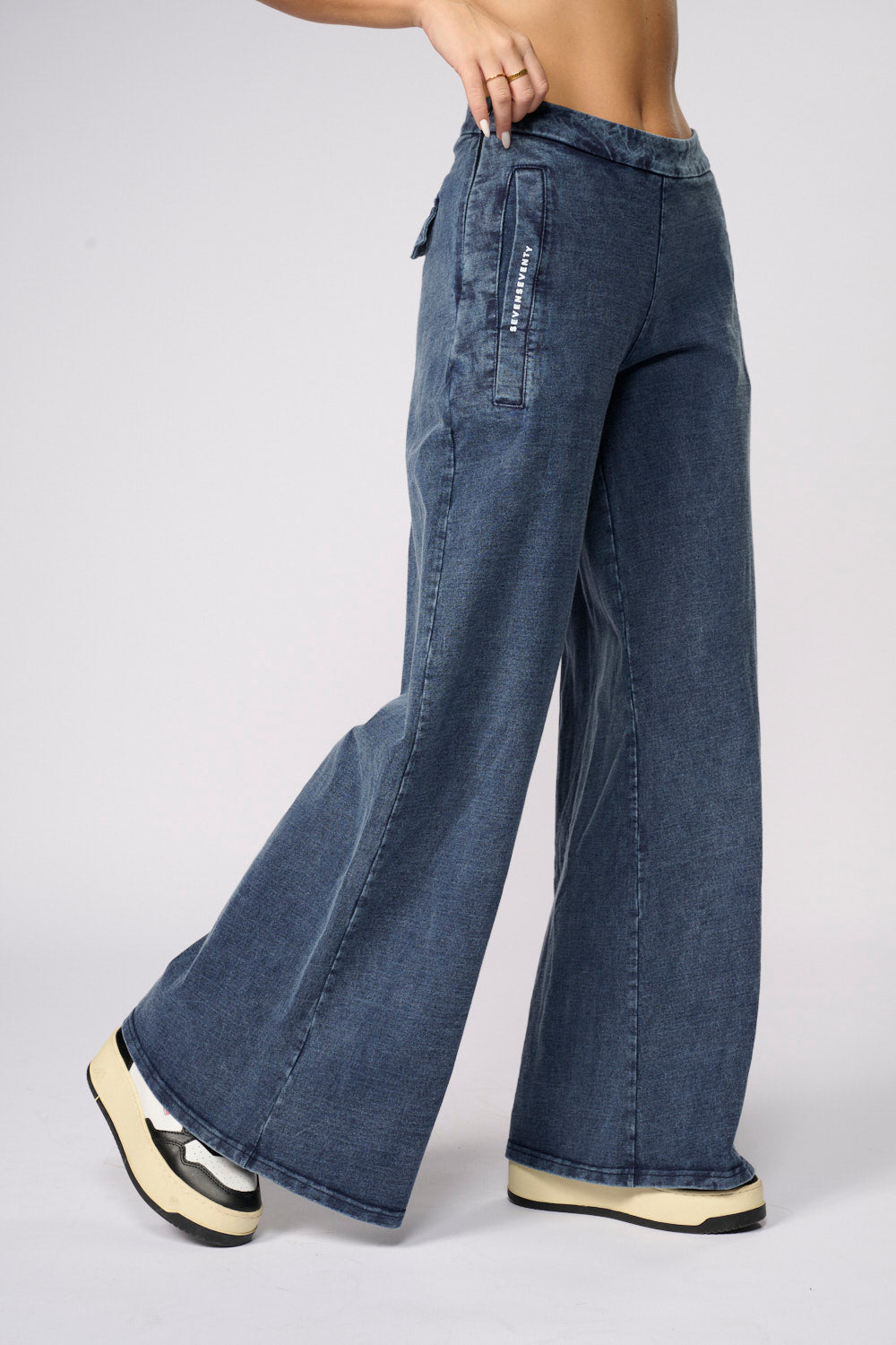 מכנס ג'ינס דק בגזרה רחבה ללא מתיחה עם סגירת רוכסן צדדי.